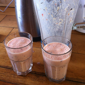 So, this was breakfast, with bananas, strawberries, blueberries, low-fat natural yoghurt and some carton of generic fruit juice mix. Tasty. It remains to be seen if the motor on the blender lasts ’til the race next year. It seems sturdy enough.