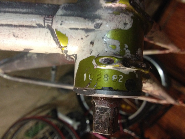 The wonderful Gothic script logo appeared, and alas, vanished, as I stripped and sanded the frame back to its original steel. It was made of Reynolds 531 tubing, and these stamps, along with the frame number under the crank, were all visible before I took it up to my mate Ian who owns a body-shop and garage, and he did a proper respray with acid etch, two-pack primer, several coats of red, and then the decals were put on (ordered from the internet), and then it was lacquered.