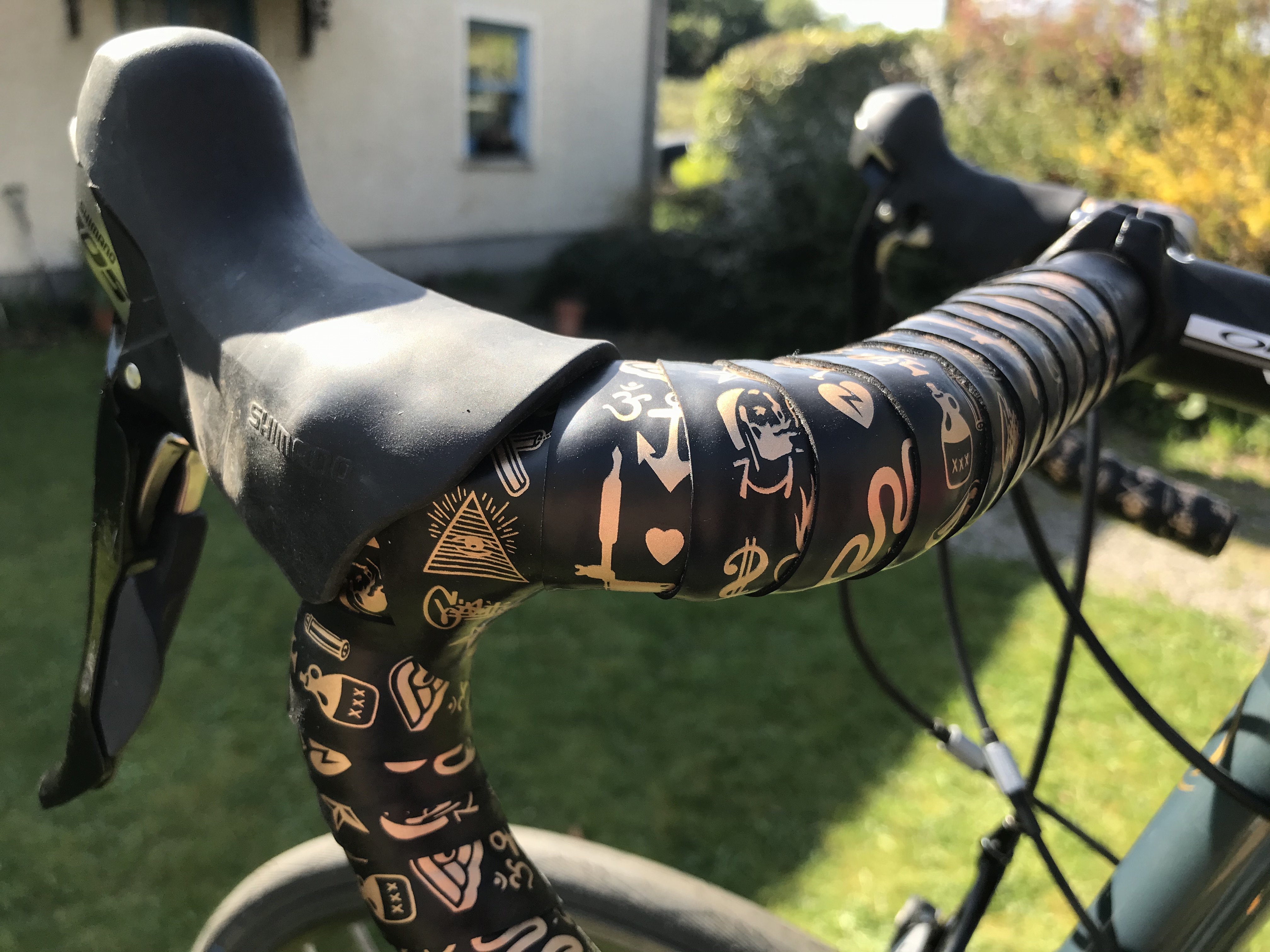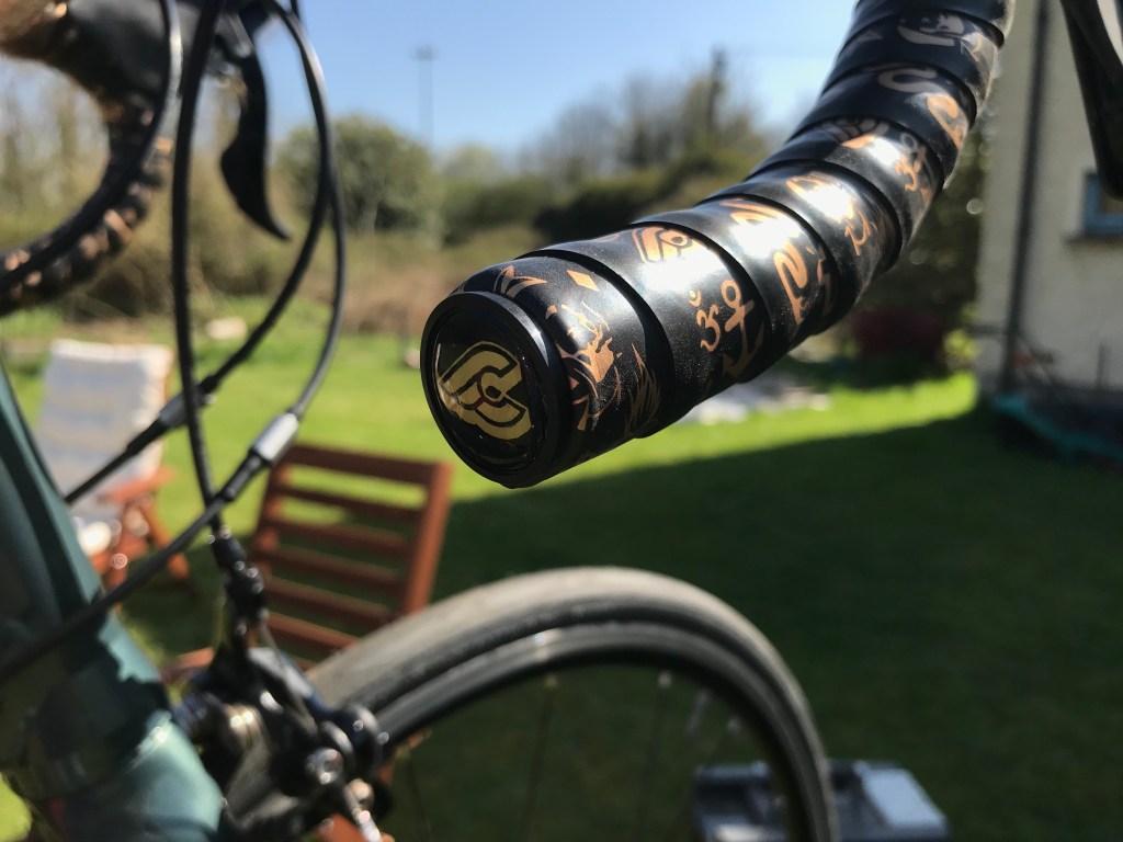 Which is why, dear friends, one of the ways to make a tiny statement to the world is to fit some funky bar tape. This one flirts dangerously with the Velominati Rules. (You would need a really smart lawyer in court. In my defence, it’s technically okay, in that it is predominantly black, and the gold matches the decals. But I suspect it breaches the spirit in many ways. But that’s the hill I shall climb to the top of and die on.)