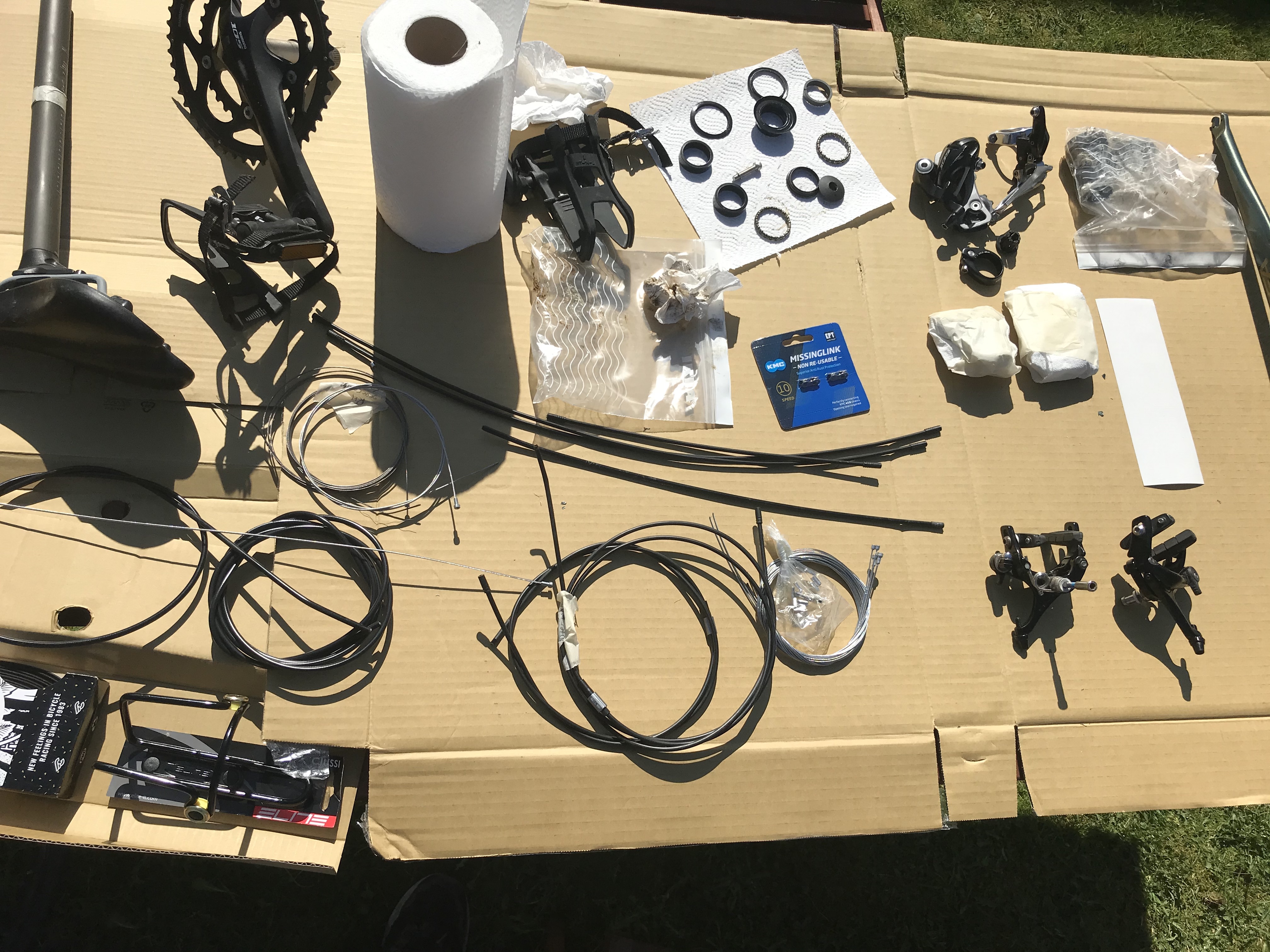 And as for the gag… well, it doesn’t really work, but such as it is: on Good Friday, we began the great rebuild, but reached an impasse when we got to the cabling, as the bike shop had given us cables that were too short. And I couldn’t swap them out ’til Saturday, when we finished off the job. And on Sunday, the bike rose again!