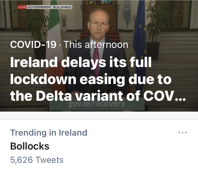 And so, we all wait in anticipation as the latest Covid variant hangs about like a bad smell. Many Irish folk have had one or both jabs. We have administered over 4 million doses so far, which equates to just over 40% of the population vaccinated. Infections are increasing though, due to the Delta Variant. And hence this caught my eye on Twitter this week: