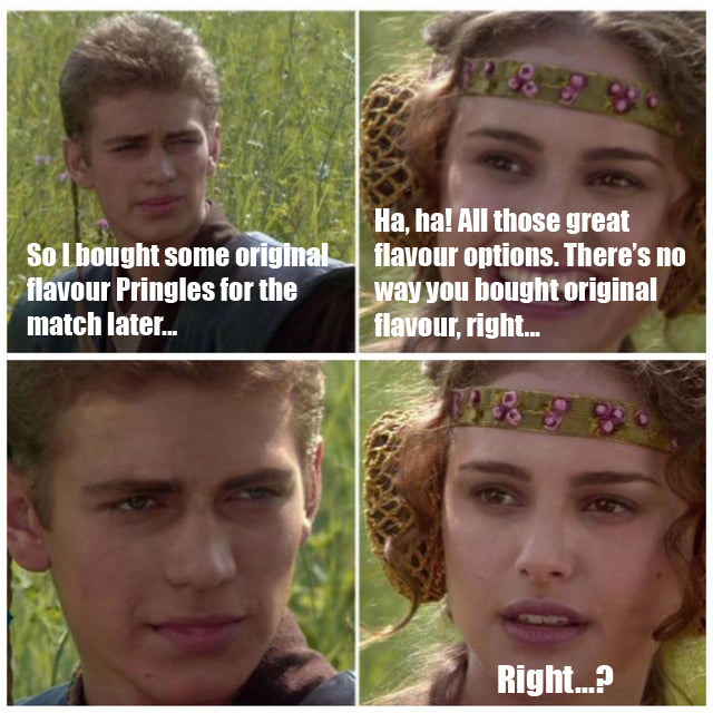 To celebrate, I made the above meme. Well, to be strictly accurate, I just added one more to the enormous pot of Anakin/Padmé panels that have spread like a viral infection across the internet (really? you had to use that phrase? ed.). It may be based on personal experience. I am not at liberty to say. If footie is not your thing, well, that’s tough, because it certainly is everywhere at the moment. Still, it will be over shortly and we can all return to normal.