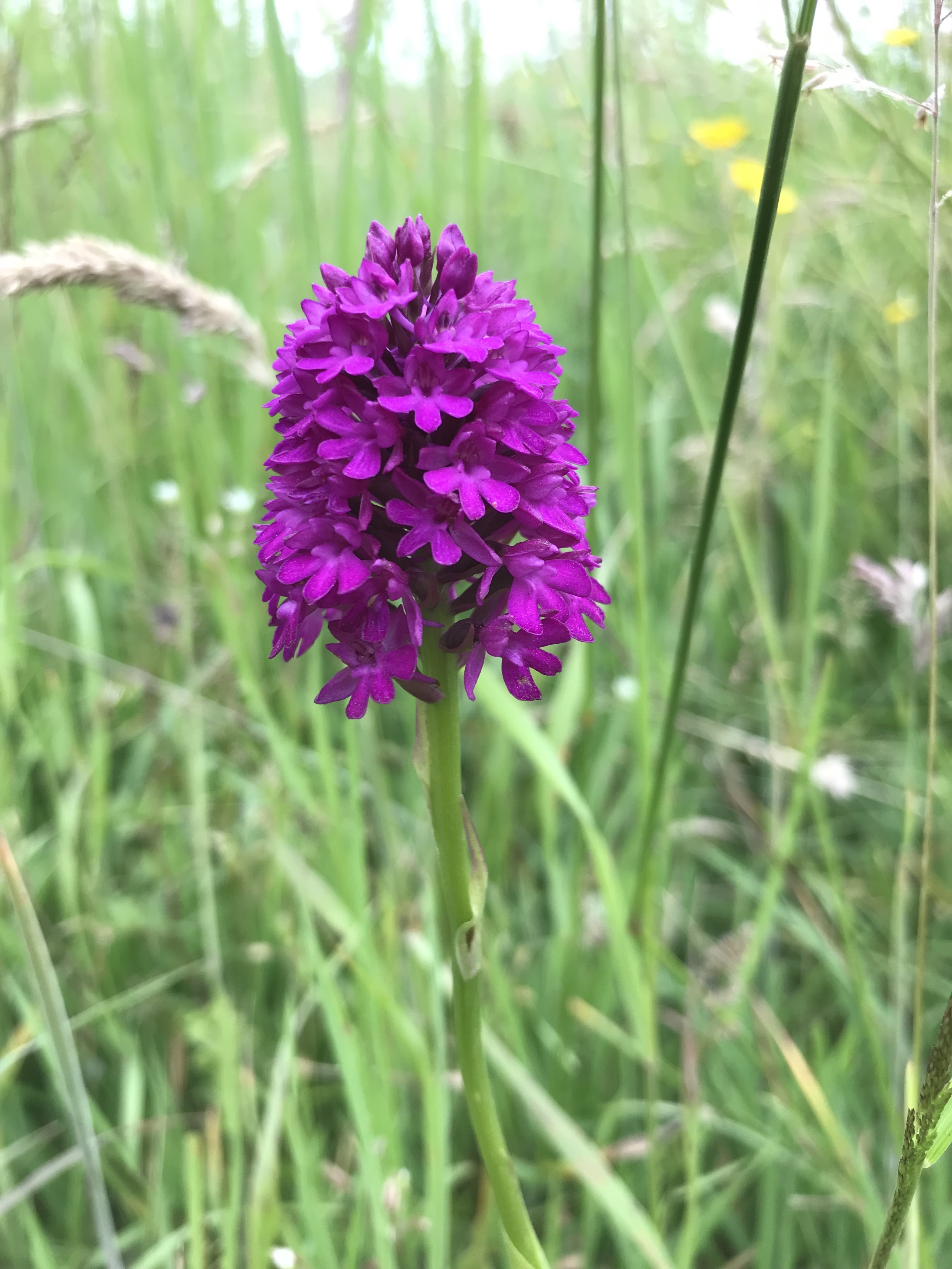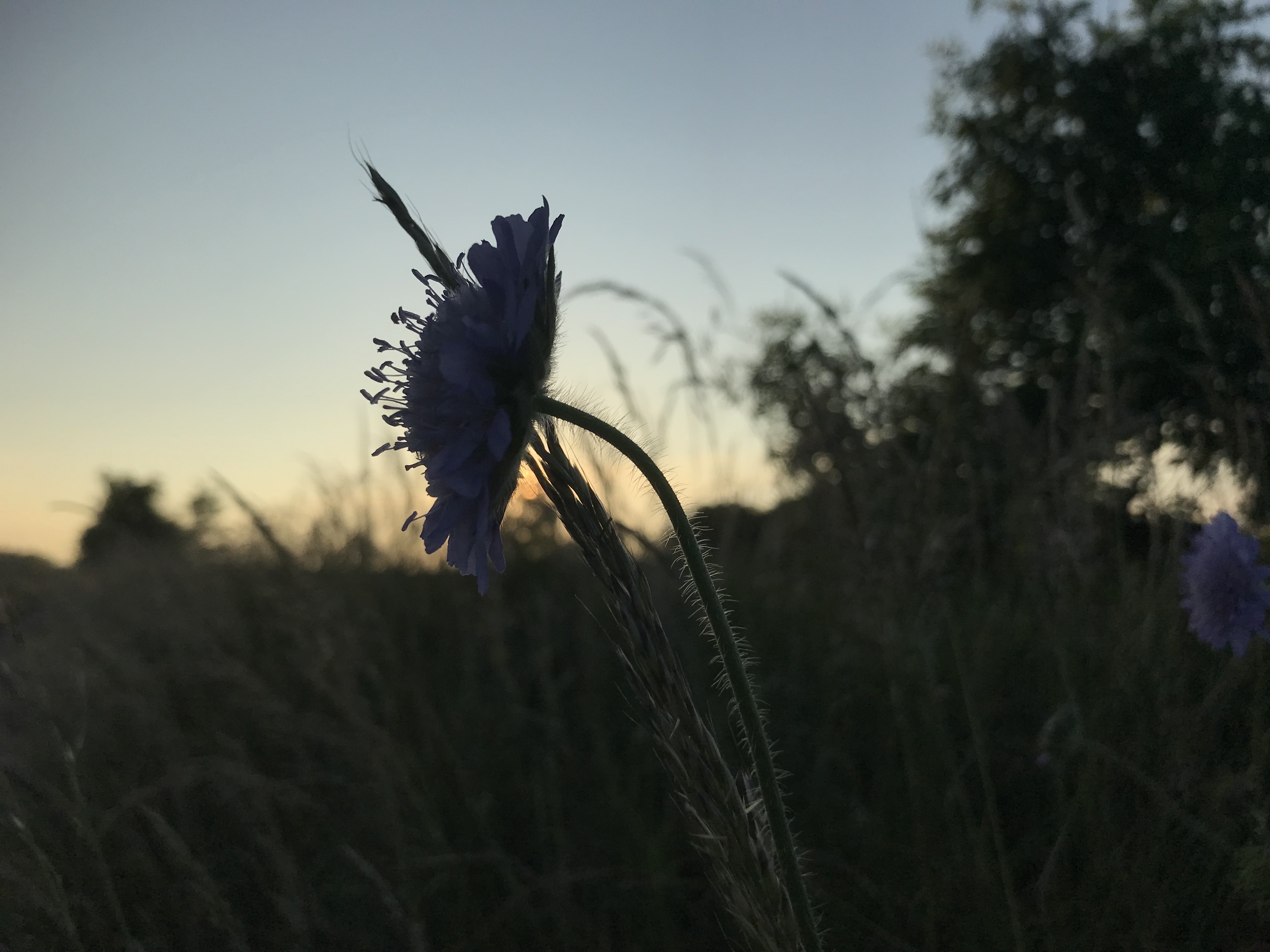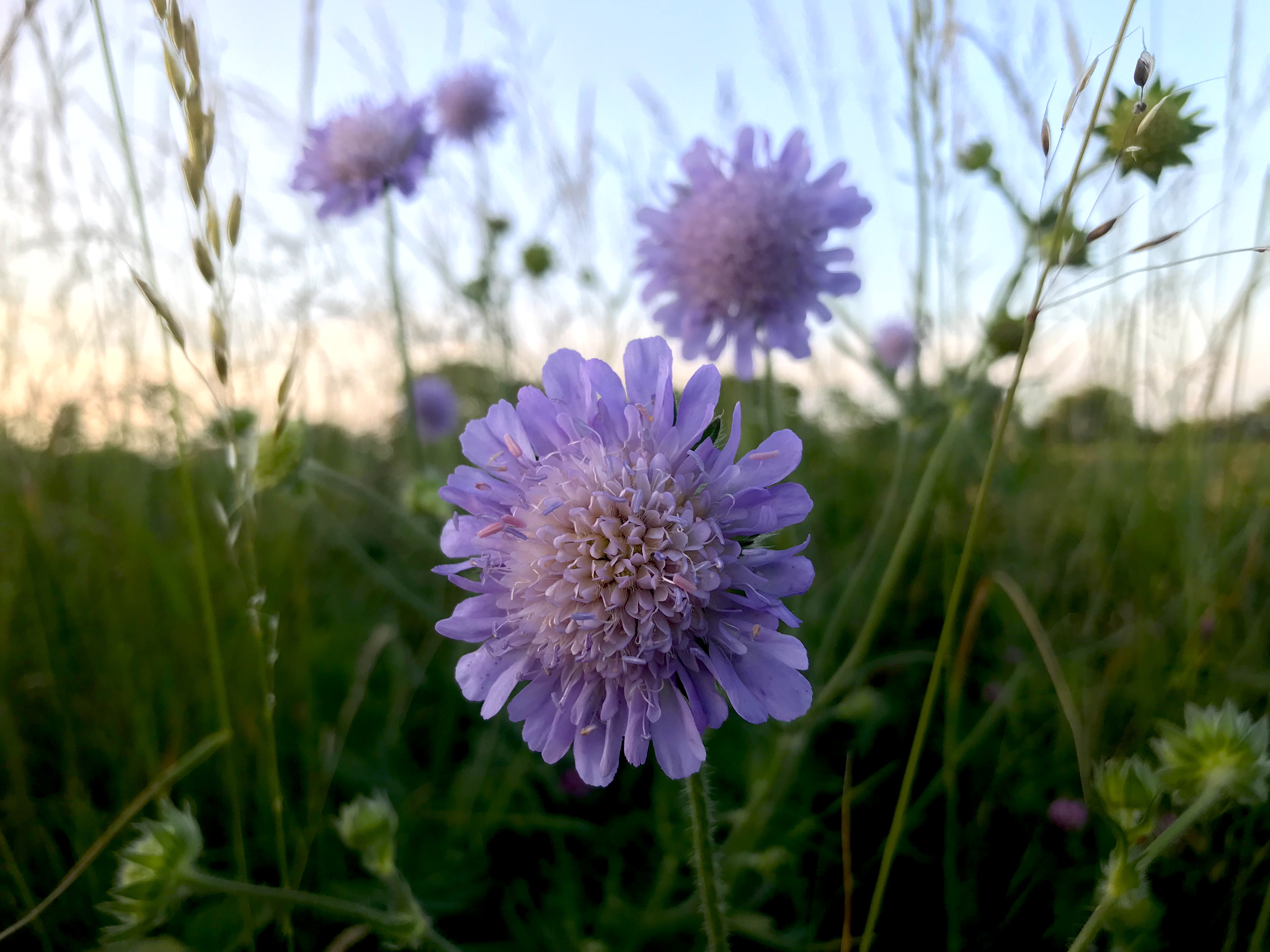 Below, clockwise from top left: Field Scabious, Common Spotted-orchid, Ringlet Butterfly, Field Scabious in silhouette, and Pyramidal Orchid from the park.
