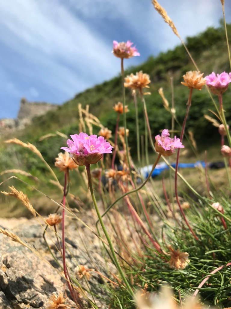 There is an old ruined stone-arched building here between the beach and the cliffs, which I gather used to be a lifeboat station. The left-hand arm of this sheltered cove is natural, but there is certainly some manmade intervention on the opposite side. It’s not a sandy beach at all; indeed, a small patch of wiry grass near the bracken is your best bet for a soft seat, and when you decide to get in for a dip, it’s perhaps no harm to wait for a quiet moment without spectators, as you will ‘ooh’ and ‘aah’ as you pick your way through the cunning collection of rocks, stones, gravel and seaweed. It’s a popular enough spot, though, and there is always a steady trickle of passing walkers. So you might just have to go for it. It’s scant consolation, but the return leg is even more treacherous as your recently-horizontal head, lightly chilled in the Irish Sea, can give you a case of the staggers as you try to reach the safety of the grassy strip where you left your towel.
