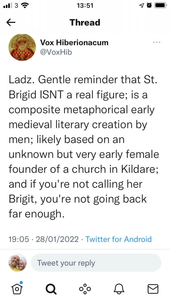 And it turns out the modern version of St. Brigid is of course another stolen figure from our pagan past. There may not even have been a real ‘Brigid’, or more likely, Brigit. She may have been an amalgam of figures. Her feast day is February 1st, which is, as any decent Irish historian knows, more commonly known as Imbolg – one of the four ‘Celtic’ festivals: Samhain, Beltane, Imbolg and Lughnasadh. The one that survives to this day is Samhain, in the guise of Hallowe’en. Worth noting that the very use of the word Celtic has been steadily eroded over recent times. And here’s one of many pieces you can read at your leisure, if you wish. Here is an excerpt, if you are too busy with other things to read the whole article: