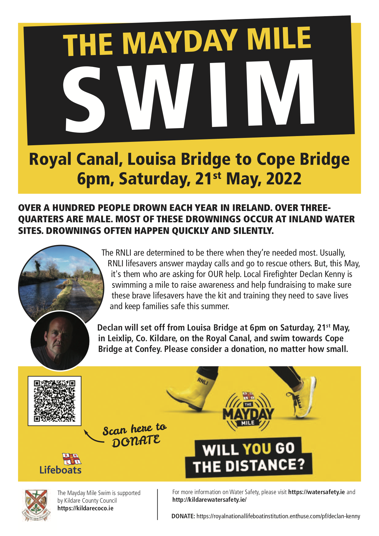 The main reason for the swim is, as mentioned, to raise some money, and get people talking about water safety. I also would like to highlight the fact there are NO official outdoor swimming locations in the county of Kildare. Other counties have them, and maintain them, and during Summer, even have lifeguards. But overall, we have a poor attitude to outdoor swimming in this country, unless it’s at the sea. I find this odd, because in truth, your average sea, accessed from the beach or rocks, is probably more dangerous than your average lake or canal. Inland waterways get a bad rap. This, I suspect, stems from an unholy trinity of health and safety, litigation and antipathy. To explain: I have had conversations with people in the council about this, and there is a general overall anxiety about providing any kind of facility that has the council’s name on it. It opens them up to liability and litigation. And additional expense, I suppose. Then there is the matter of water quality. Some counties fare better than others on this score, but in general, I don’t think Ireland’s green credentials survive scrutiny when you scratch the surface. So in order to provide safe outdoor swimming, you would have to provide safe water quality too.