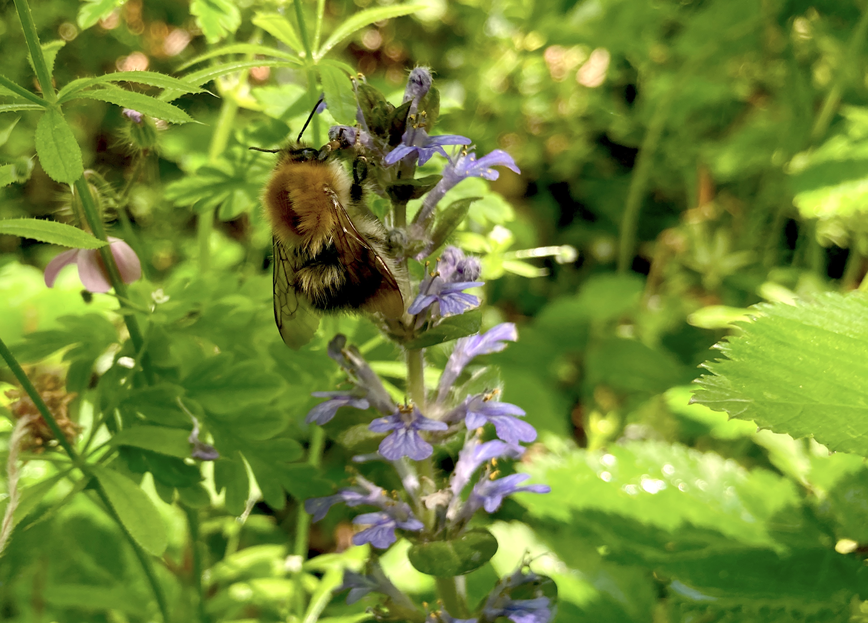A bumble bee on a Bugle flower. This pretty wild flower is very much NOT poisonous!