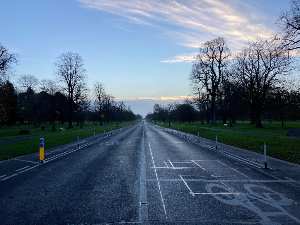 I made it through unscathed and emerged into civilisation at the M50 aqueduct, stopping for a quick snap which I made sure to send to my brother who was by now safely back in Italy. I turned off the canal at Ashtown and entered the Phoenix Park. Skirting the northern boundary wall, I soon crossed over the main road at the Castleknock Gates. Another quick snap was required, this time looking east up Chesterfield Avenue – the scene of many a Dublin Marathon, though of course, on this cold and clear morning, there were no thousands of keen marathoners thronging the road.