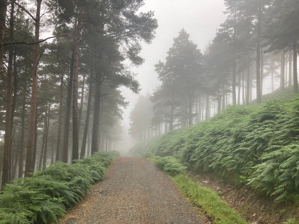 I am back on a classic fire road. There has been a lot of clear-felling here, and the results (though I cannot see much in the gloom) make for an equally gloomy spectacle. A few shattered stumps remain, and the odd, bizarre bare and blasted slender trunk of a pine stands as a lonely sentinel amongst the carnage. Yes, I get this is forestry. It’s planted for a reason, and you cannot get timber without cutting down some trees. But I can’t help feeling there isn’t a better way to do this business. Certainly a more mixed woodland would help, and a different programme of felling and planting. But that is an argument for another day, and so I climb on.