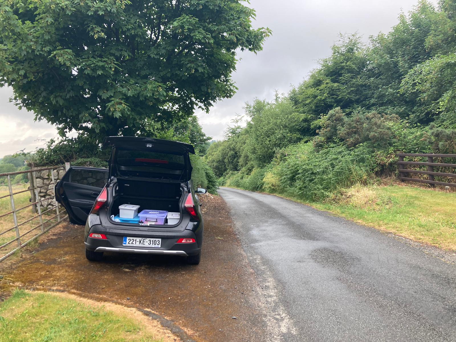 Gary arrived, and the packing commenced, and shortly we were off on our adventure. The spin down was reasonably uneventful. As we neared Carlow and the little village of Clonegal, we could see rain clouds beginning to gather over the higher peaks. But for now, the rain was staying away, and it was very warm with little breeze.