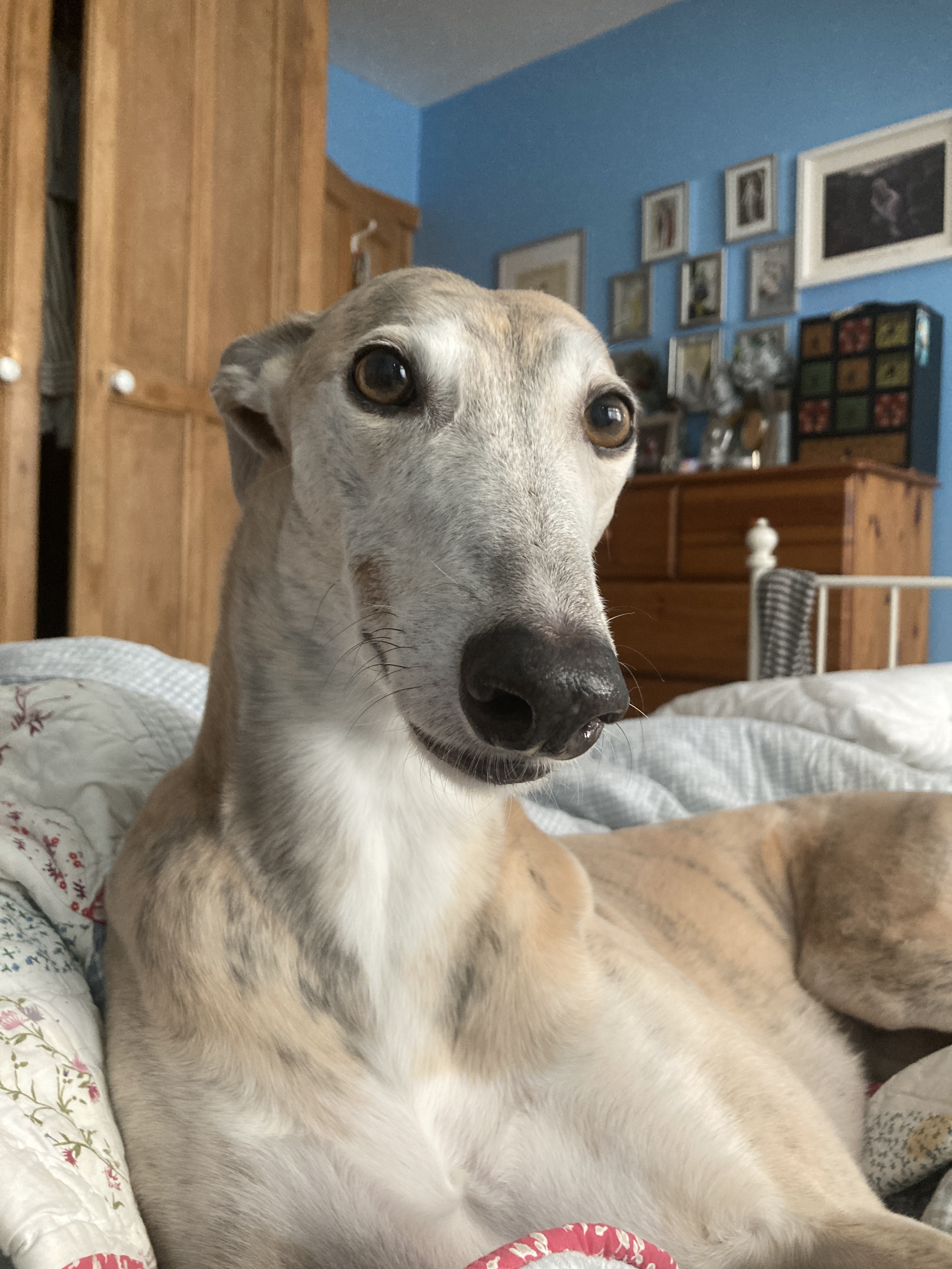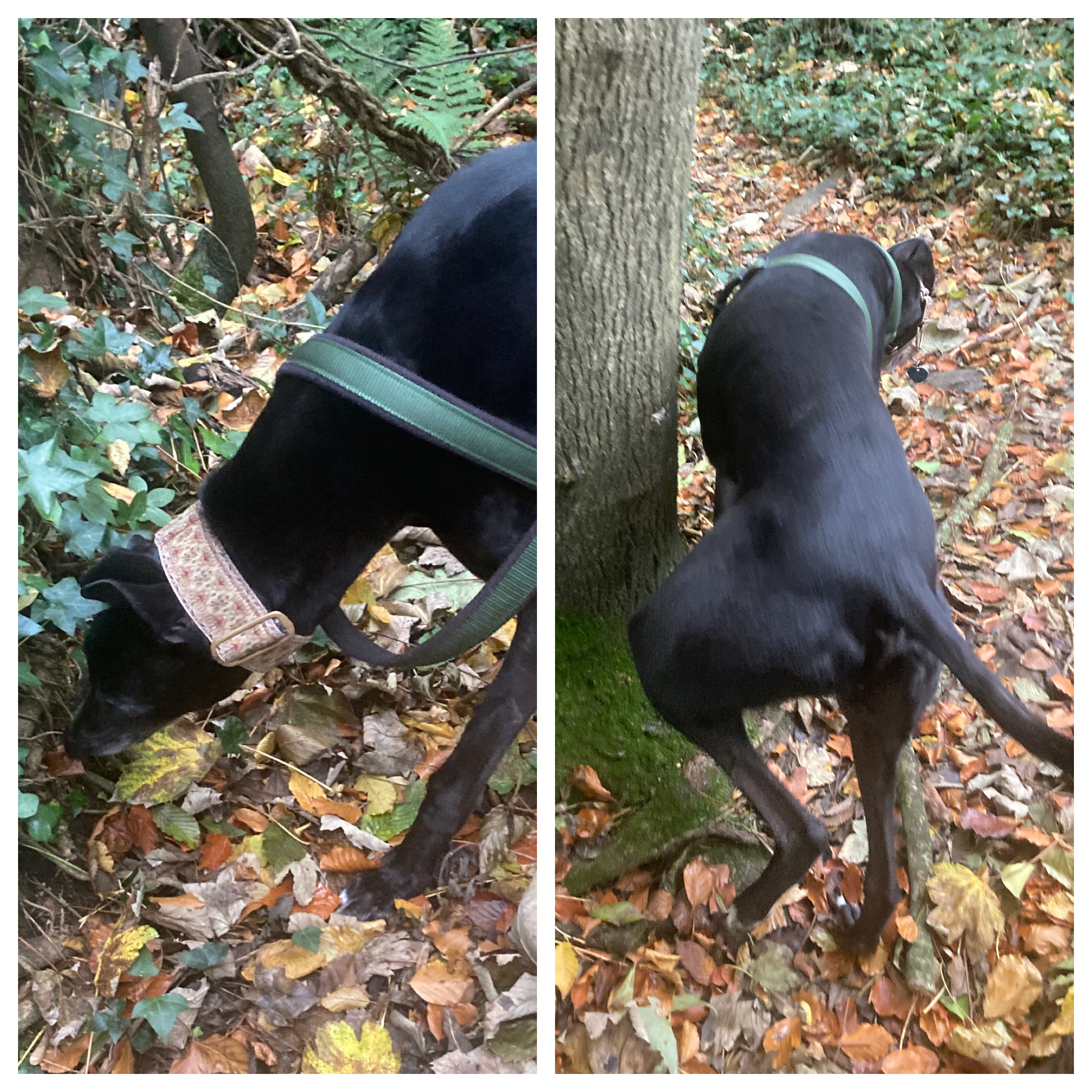 Well, after all these years, you would imagine Bonnie would certainly avoid such ignominy, but no, she repeatedly gets widdled on. The routine is always as follows: Odi stops as he finds something fascinating. He sniffs. Bonnie senses there is something interesting to be sniffed too, and dives in. Odi has moved on at this point from sniffing to ‘responding’ and Bonnie is often the unfortunate recipient.