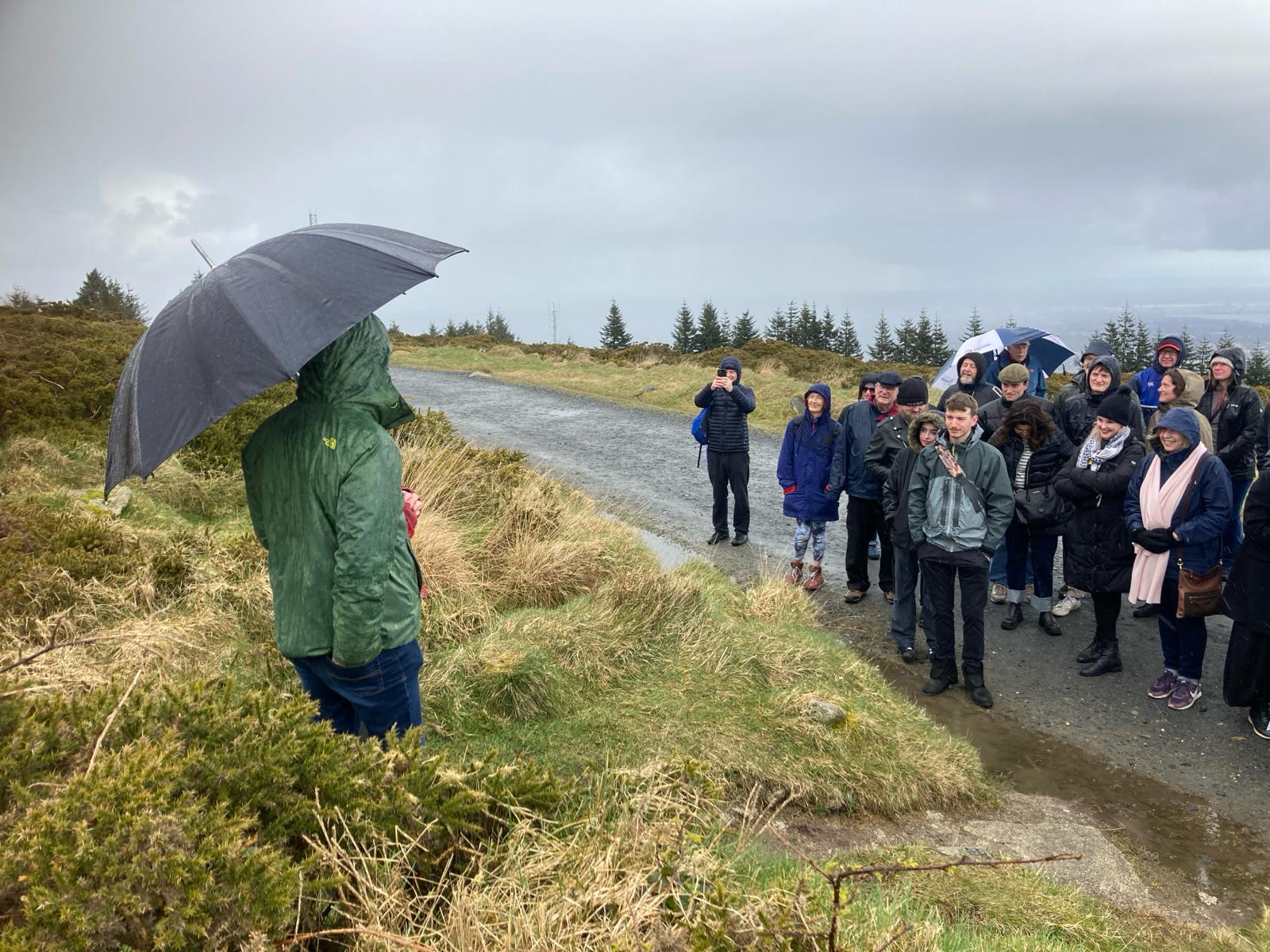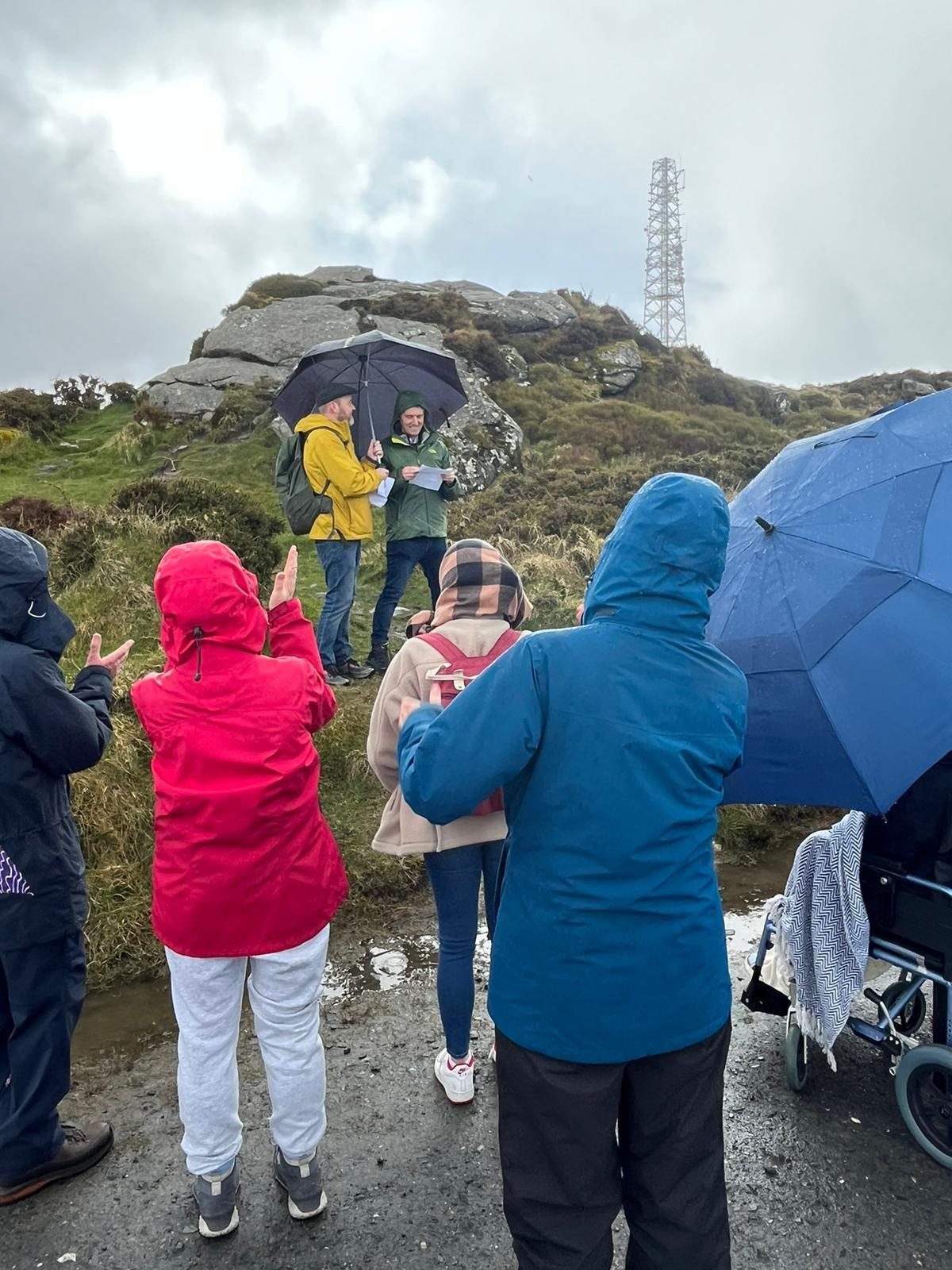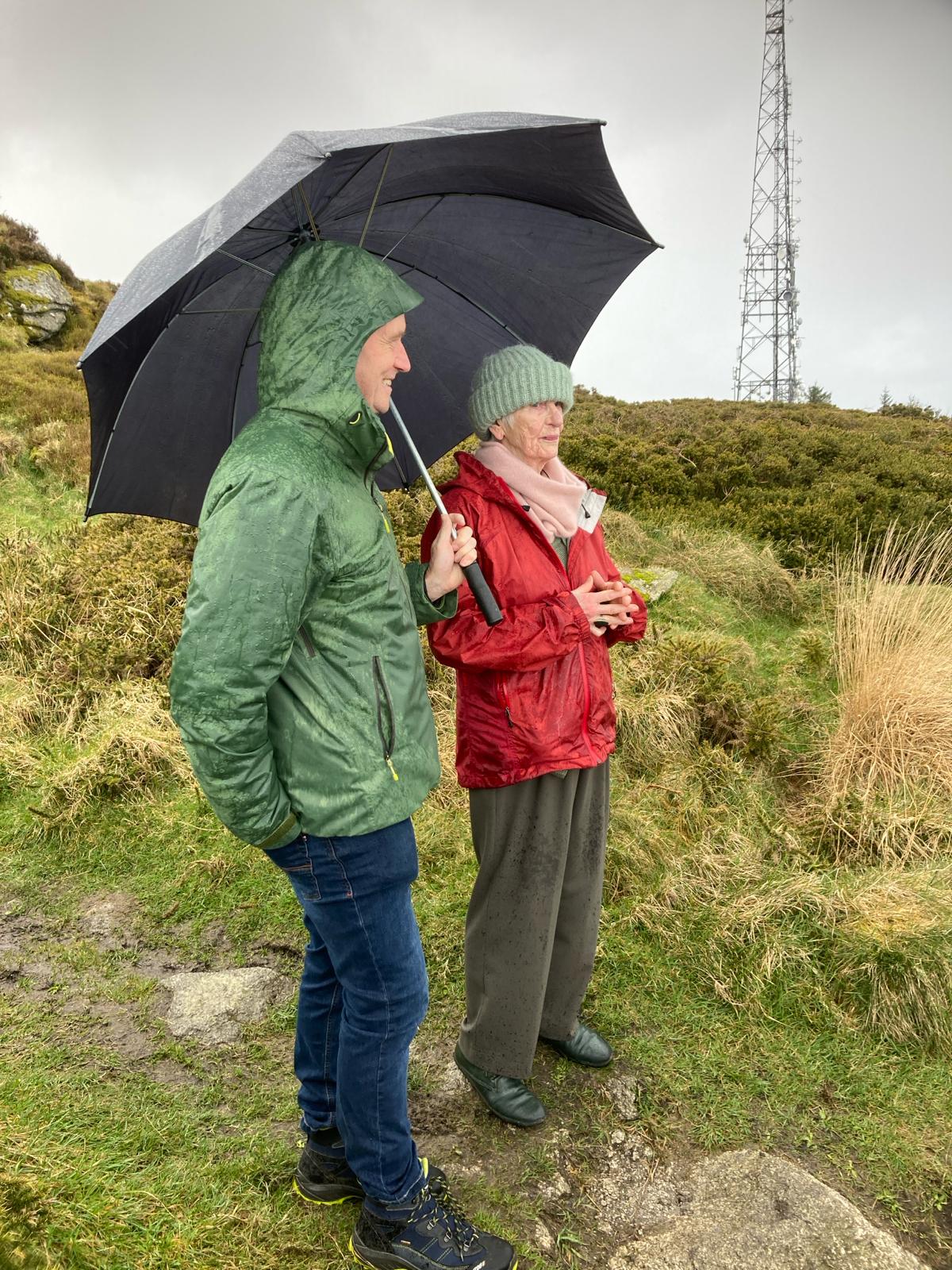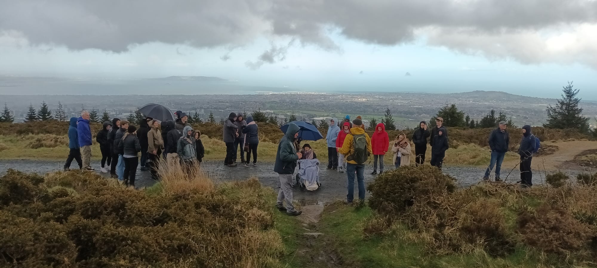 By the time we arrived, a little flustered, to the pub car park, there was a good crowd of people waiting for us. My brother Robert reckoned there were about 45 in total. We car-pooled up to Ticknock to begin the climb to Three Rock. (Needless to say, there were further mini-dramas as one or two drivers managed to get lost in the short, two-mile spin from one car park to the other). But we all made it there in the end, including my Mum, who was bundled up in blankets and shawls and pushed along in her wheelchair.