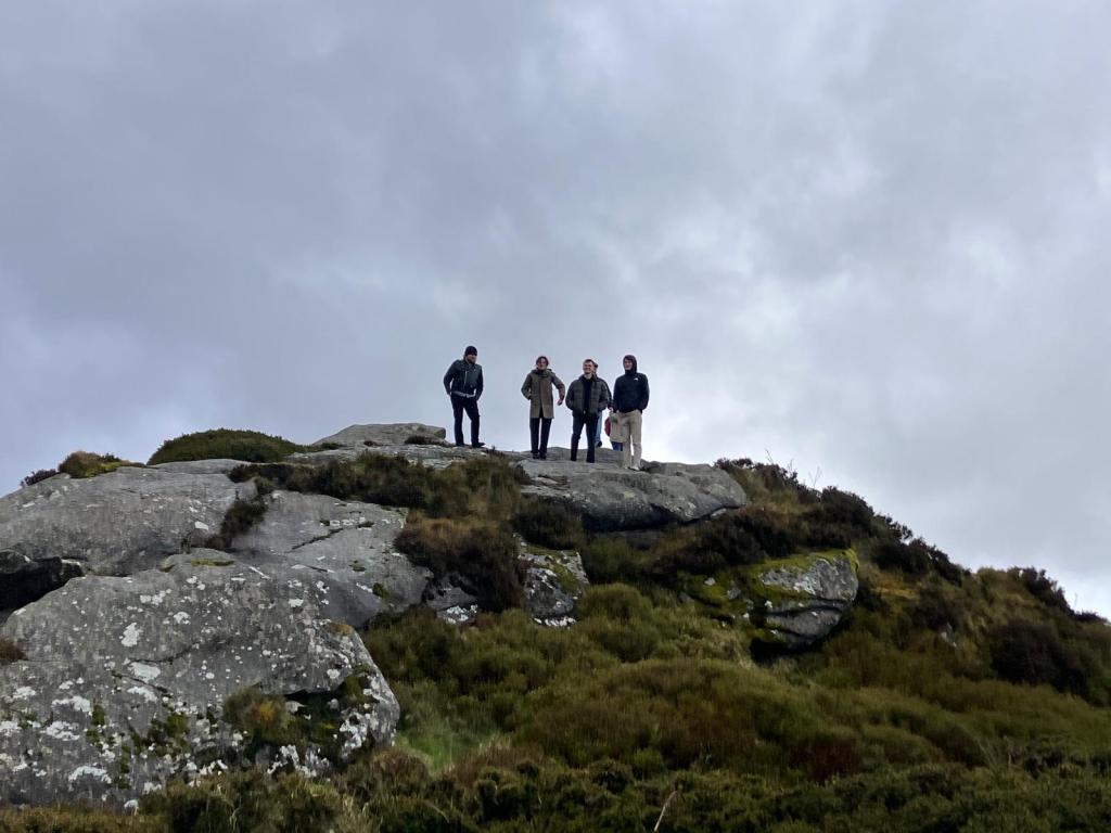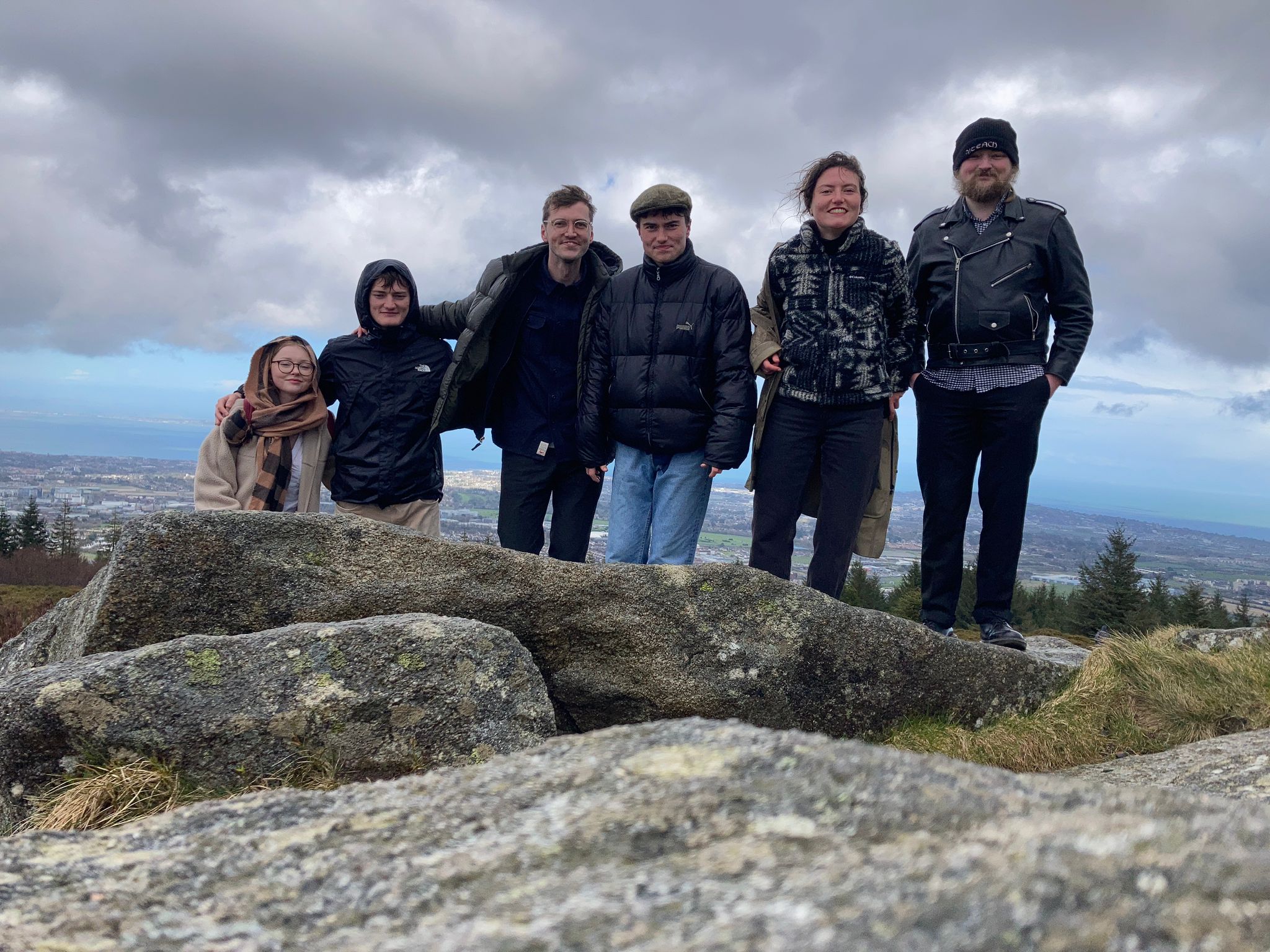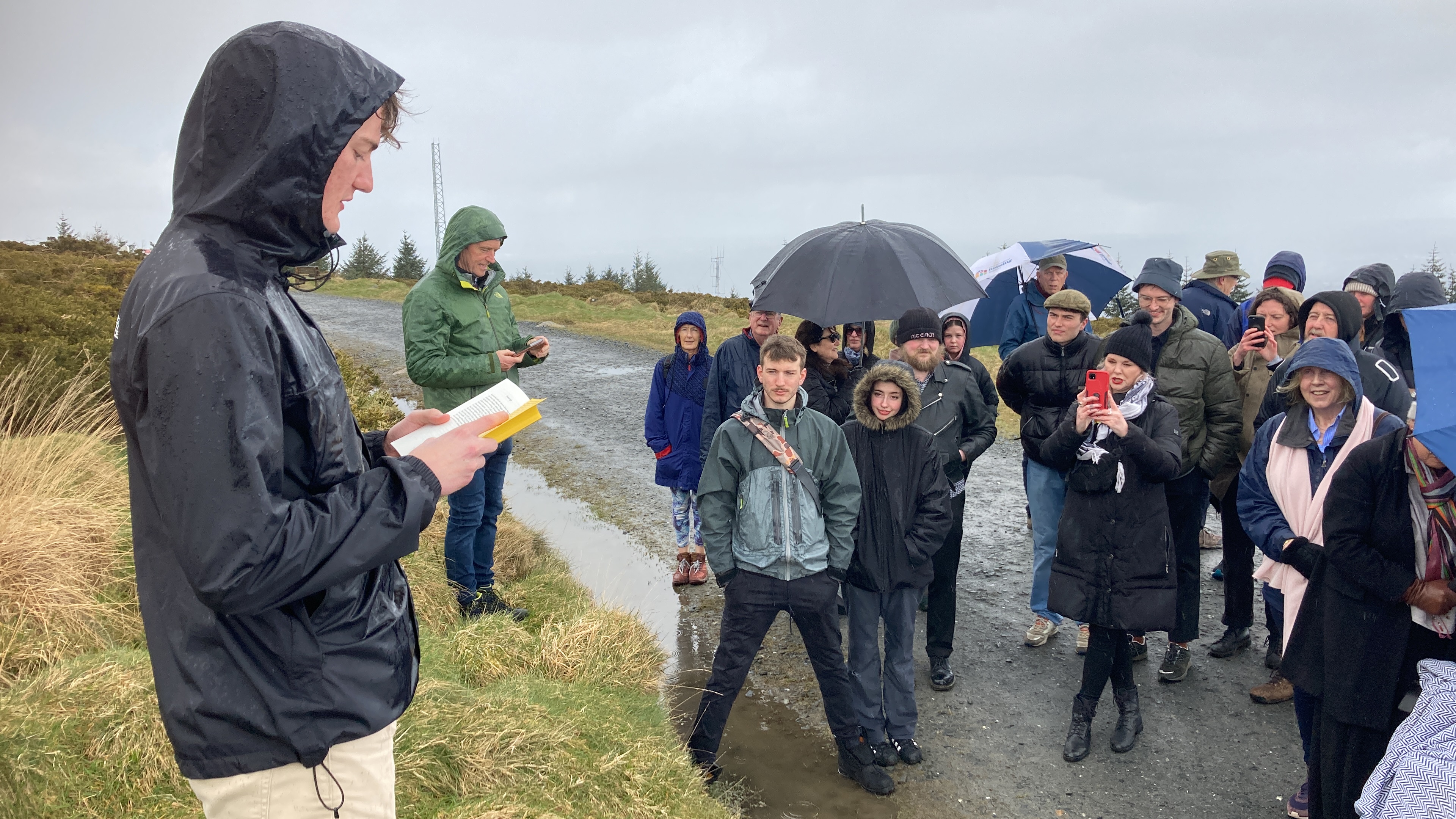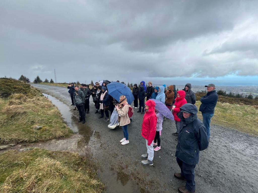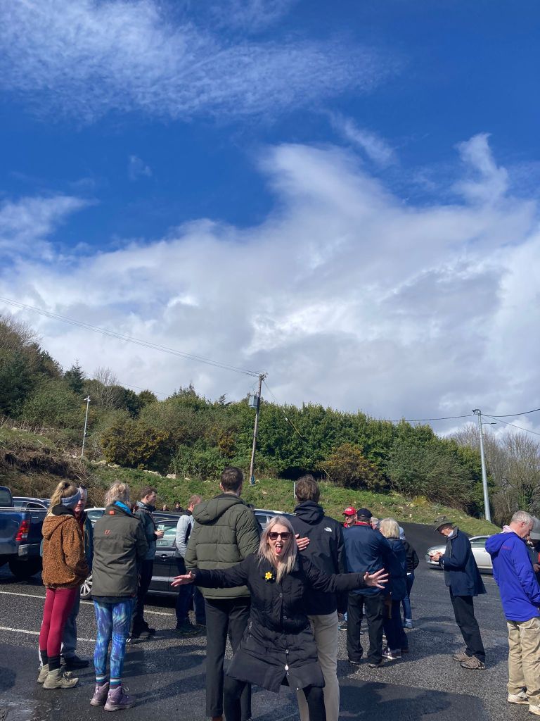By the time we arrived, a little flustered, to the pub car park, there was a good crowd of people waiting for us. My brother Robert reckoned there were about 45 in total. We car-pooled up to Ticknock to begin the climb to Three Rock. (Needless to say, there were further mini-dramas as one or two drivers managed to get lost in the short, two-mile spin from one car park to the other). But we all made it there in the end, including my Mum, who was bundled up in blankets and shawls and pushed along in her wheelchair.