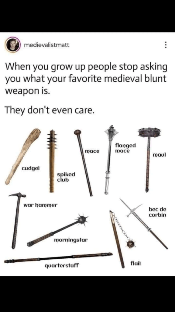 I popped this little meme above into the family WhatsApp group (that’s just the four of us). Dallan was first to respond with ‘The flanged mace, personally. Simple, effective, that’s a weapon.’