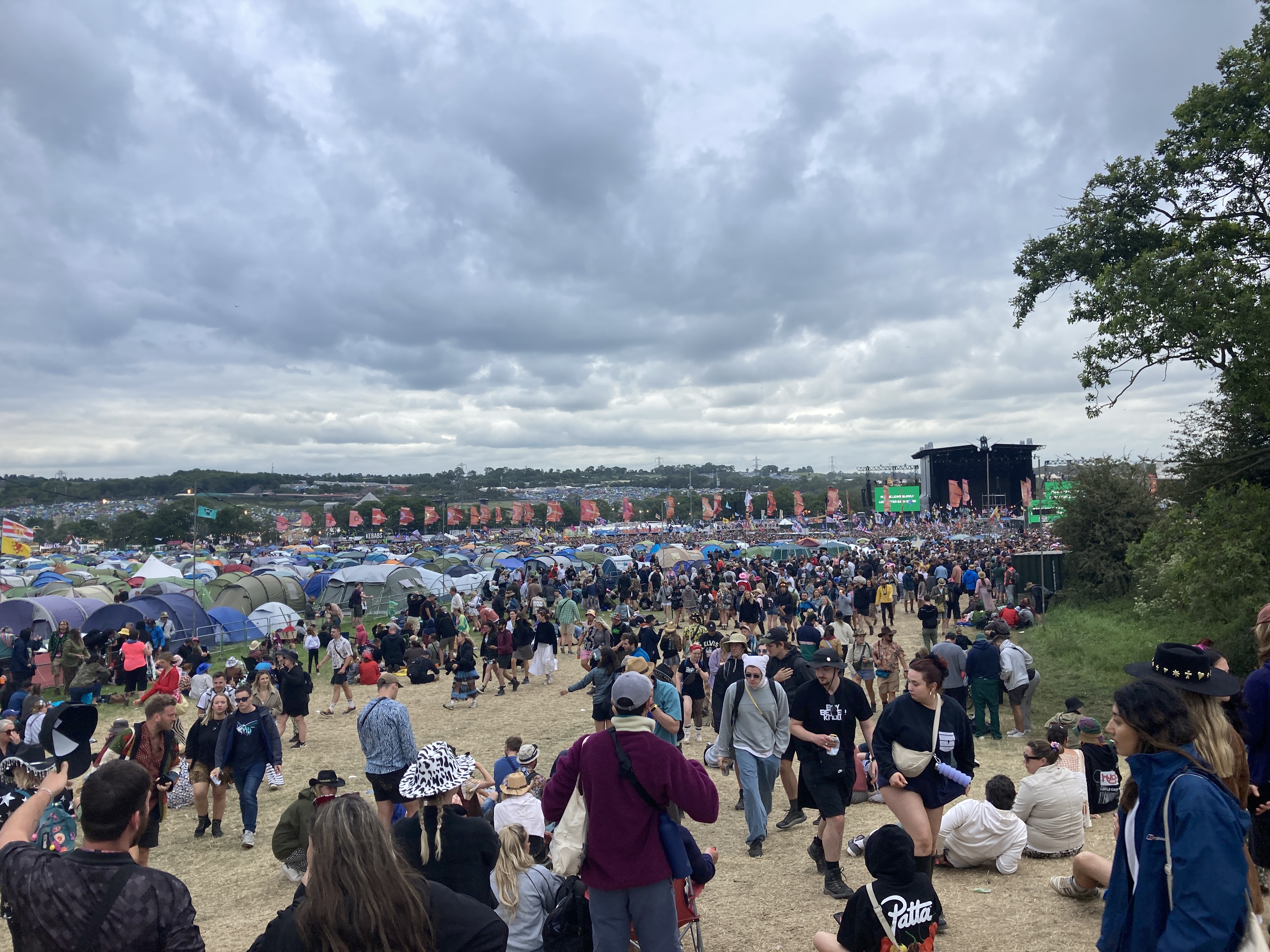 I have never been to Glastonbury. It started in 1970 and the entry fee was one pound. That included free camping and free milk! It has grown massively over the years. The current site is about 1,100 acres – enough to encompass 500 football pitches. The steel wall that surrounds the actual music venue is 8 miles long, and beyond that, there are multiple fields for campsites and parking. It’s really hard to comprehend the size of the thing; there are over 200,000 people here, and the site stretches as far as the eye can see. Literally. We are in a valley, but when you get to a spot with a little elevation, you look up and across, and you can still see the festival, unending – seemingly – twinkling off into the distance like some vast army about to break camp and march on its enemy.