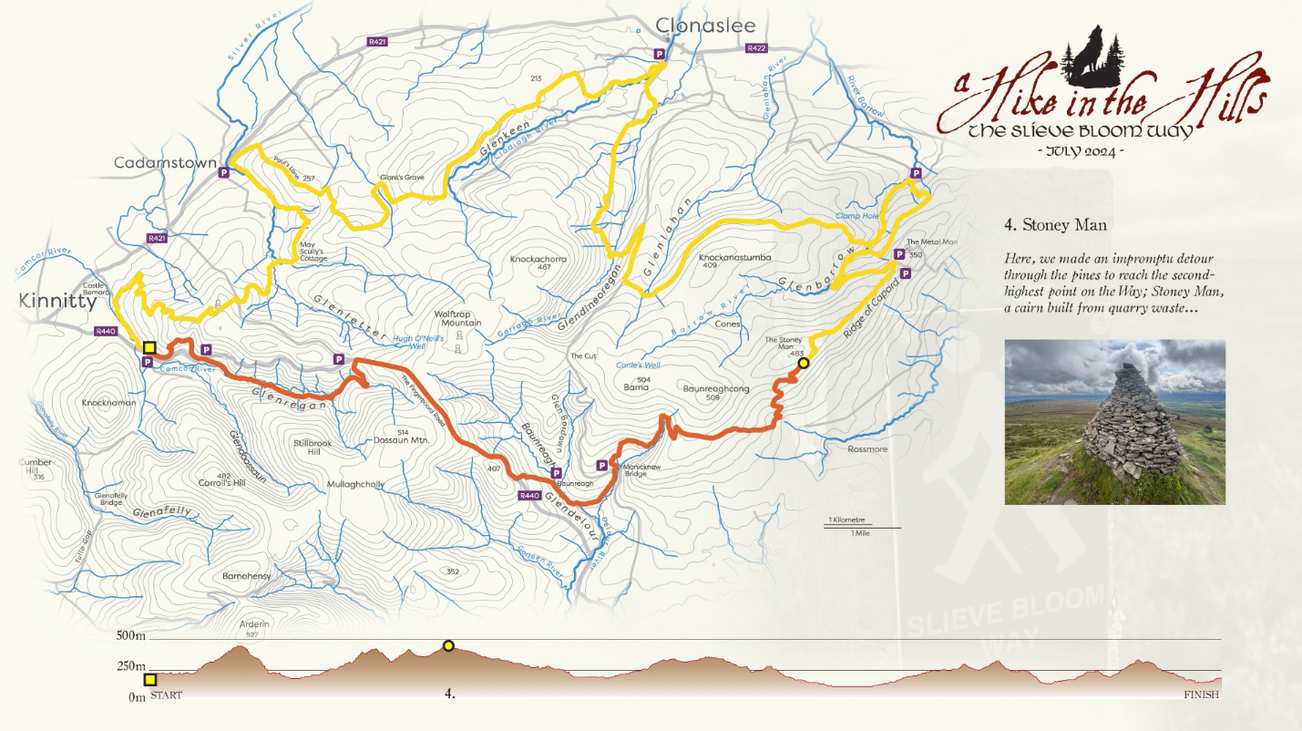 You can get a potted overview of the Slieve Bloom Way here. It’s a looped walk of over 70kms, and can be found in the midlands of Ireland. Most folk think of the midlands as being flat and somewhat boggy, but the Slieve Blooms are a mountain range between counties Laois and Offaly, and are rather splendid in their own way. They don’t have the cachet of the Connemara ranges, or the peaks around Killarney, but they have their own charm and loads of history. They are not particularly a ‘destination’ attraction, and that is being somewhat addressed by the tourist board in their rebranding of the regions.