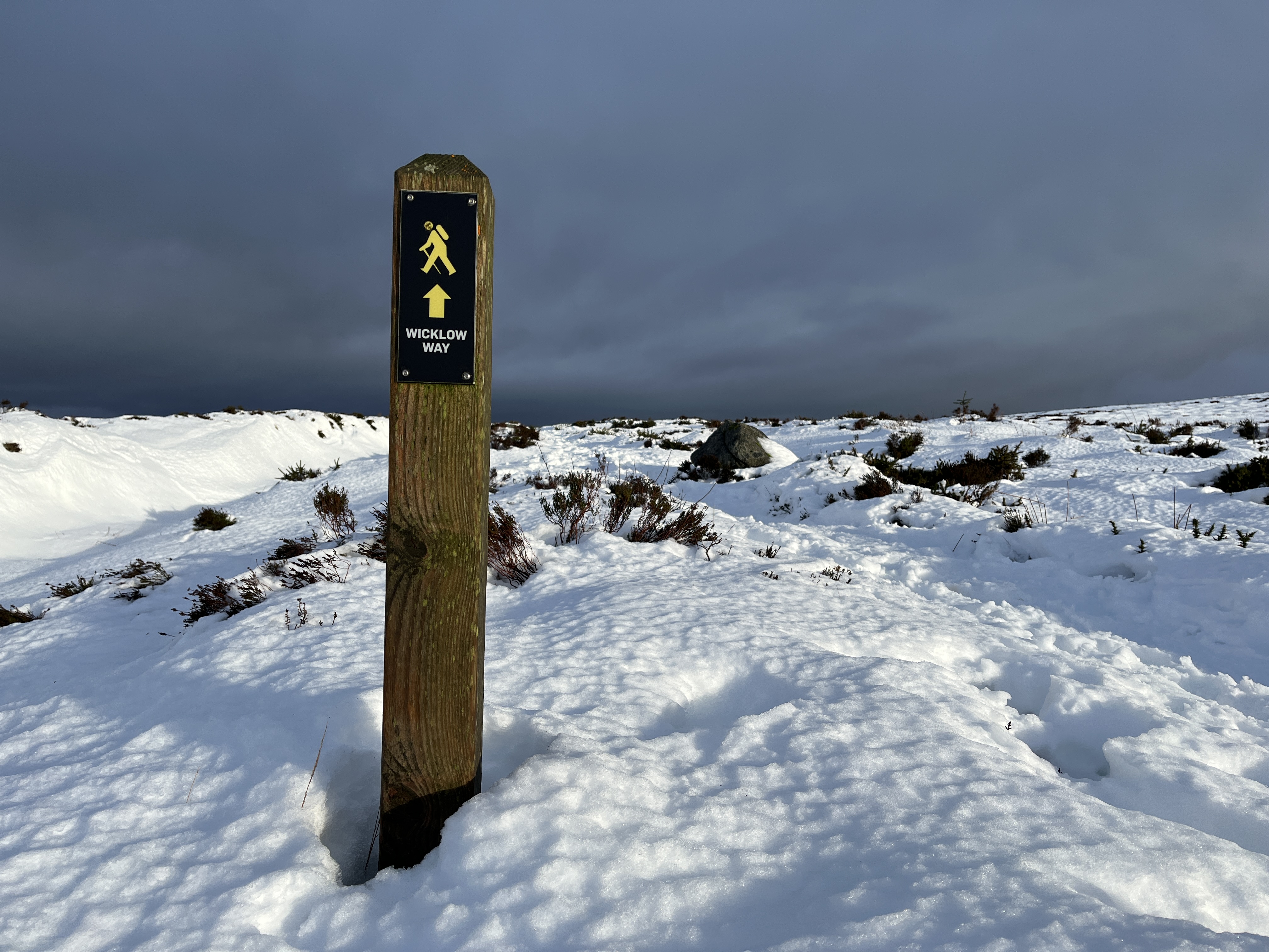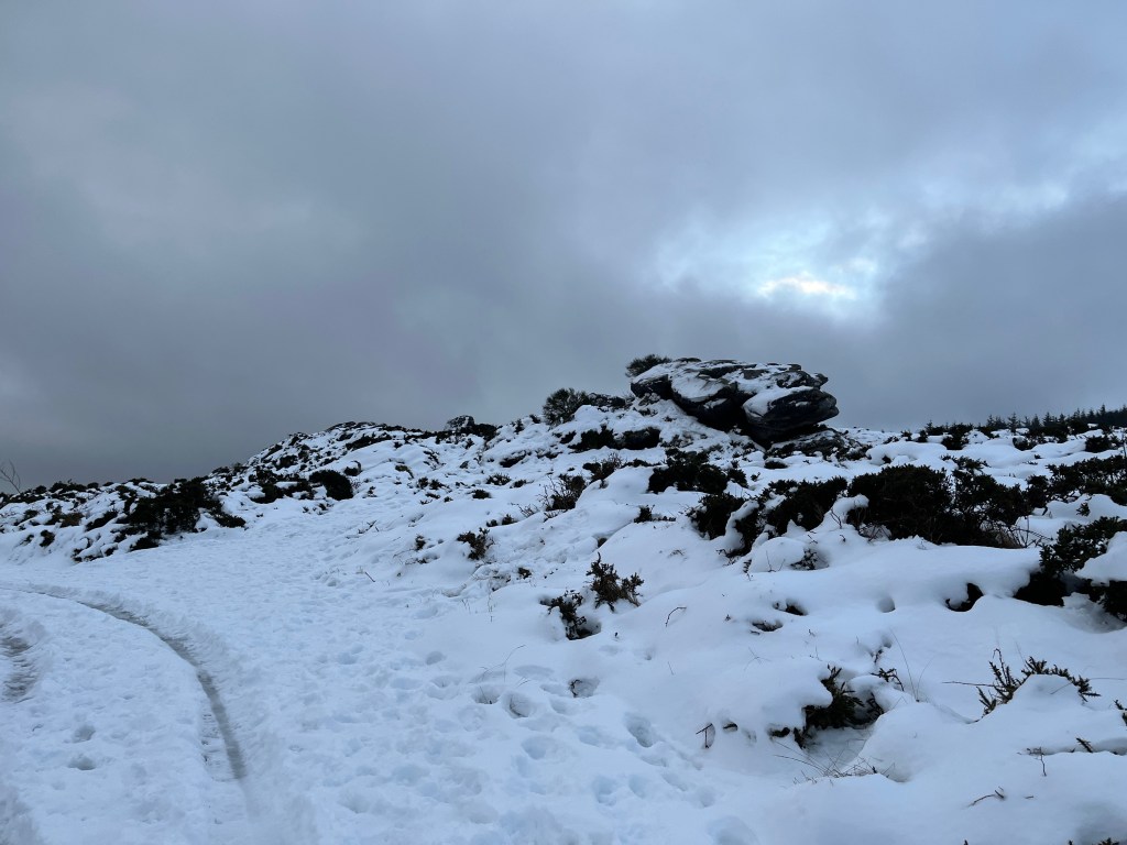 We donned our jackets and headed up towards Three Rock. Each step brought us into more snow. There was a cold wind, but not chilly; clearly the thaw has set in. As we cleared the woods and rounded the bend towards Three Rock itself, the weather was clear enough to afford a decent view over south Dublin and out into the Irish Sea. Not clear enough, alas, as the previous few days of stone cold when you could see the snow-capped mountains of Snowdonia and Yr Eifl in Wales. The latter range has been Anglicised to The Rivals, which you can see happening, in fairness, though in Welsh, it possibly means ‘the forks’. But no views today. Today we were lucky with the weather because my forecast from the aforementioned met office said rain for most of the morning. And so far, it had not rained. Hush now!