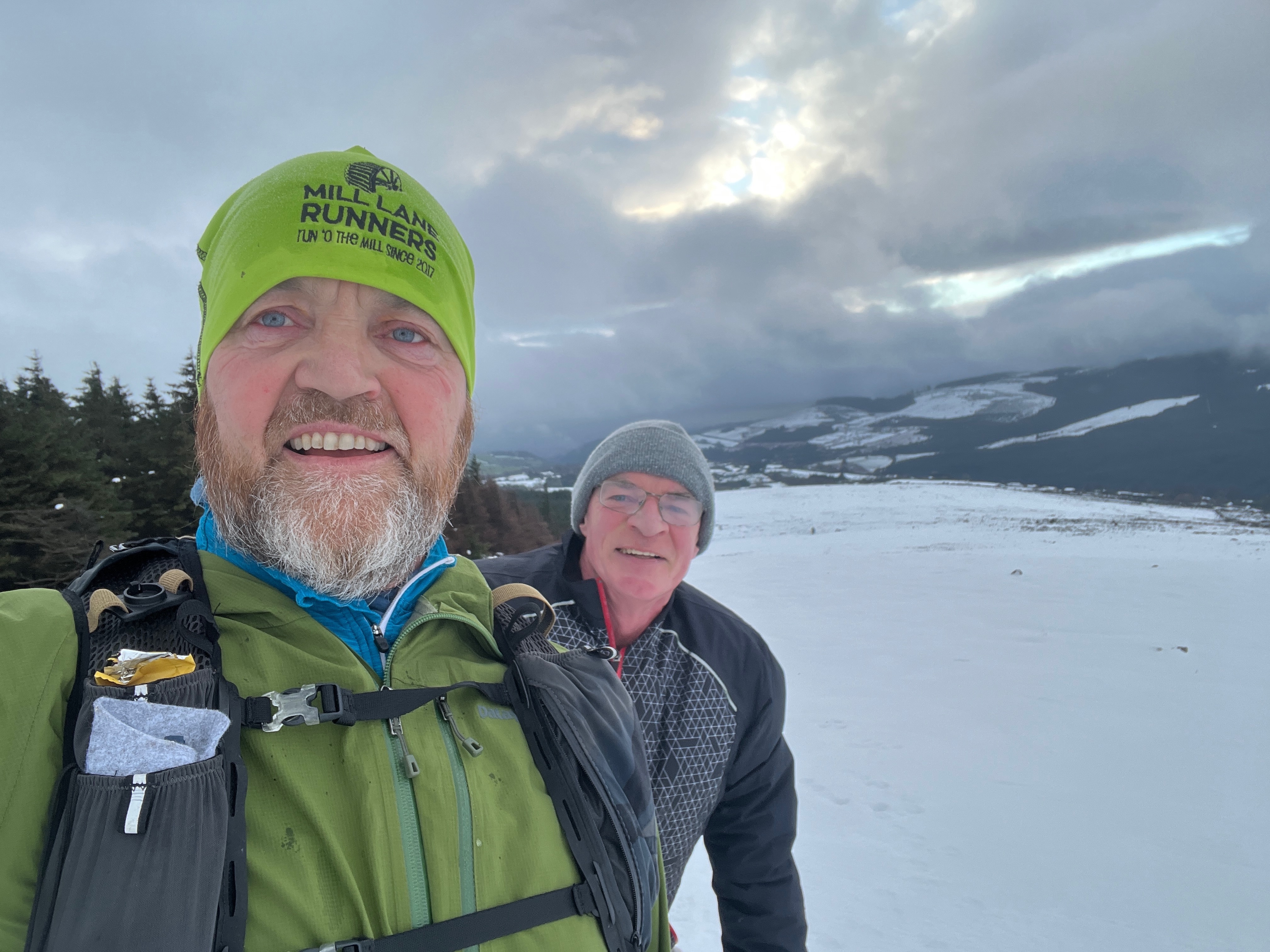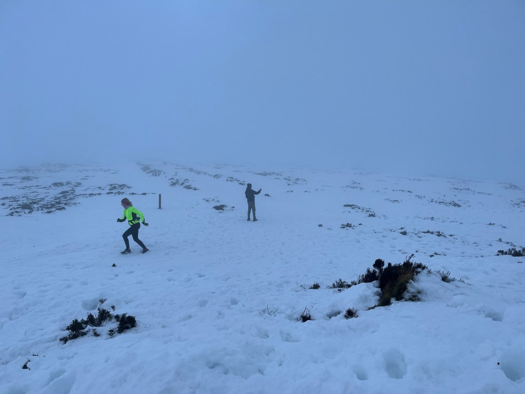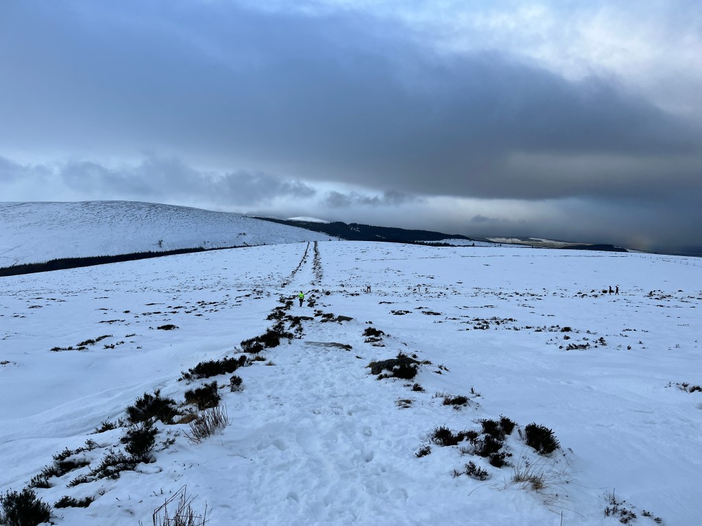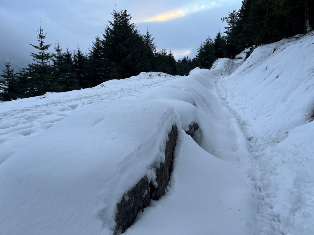 Ordinarily, this climb is ‘runnable’. It is a bit of a scramble over rocks and heather. There is a well-worn path, but this morning, it was pot luck. Here you really needed nimble elf-feet. But we possessed none, and at times the crust would hold and you would proceed forward, whilst other times you would plunge up to your knee in snow. It was a lottery, but a fun one, as long as you moved steadily to avoid catching your foot in a gully and doing some damage.