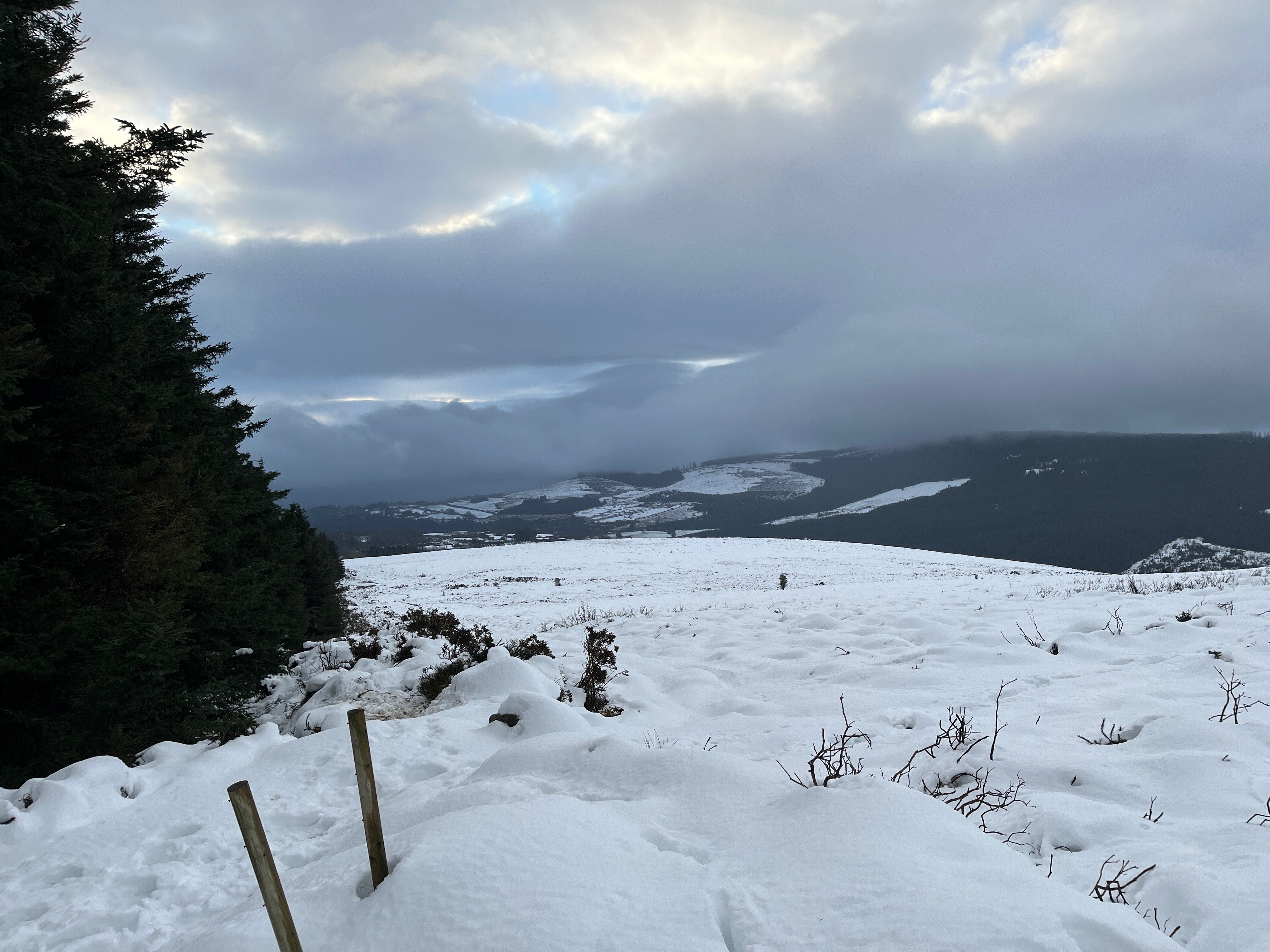 I like to take the hounds to the dog park after hours. Most patrons, especially those with dogs, drive to St. Catherine’s and therefore must vacate by closing time or get locked in for the night. So if I leave it ’til after 5pm (winter hours) then we usually have the place to ourselves. Then they get to run around off-lead and have a good mooch, which is all hounds want really; to mooch, stop, sniff, wee and then repeat. A dog lead is really quite a nuisance for everyone concerned. And the dog park is on the top of a rise, and each time I take the path up to it, a panoramic of the Dublin Mountains pops into view. And this last week has been an awful tease: snow-capped peaks abound! Of course, the evening news leads with idiots getting stuck and abandoning their cars up in the Dublin and Wicklow Mountains, and I have no wish to feature on the telly in such a fashion, or add to the load of the mountain rescue teams. Oh the shame!