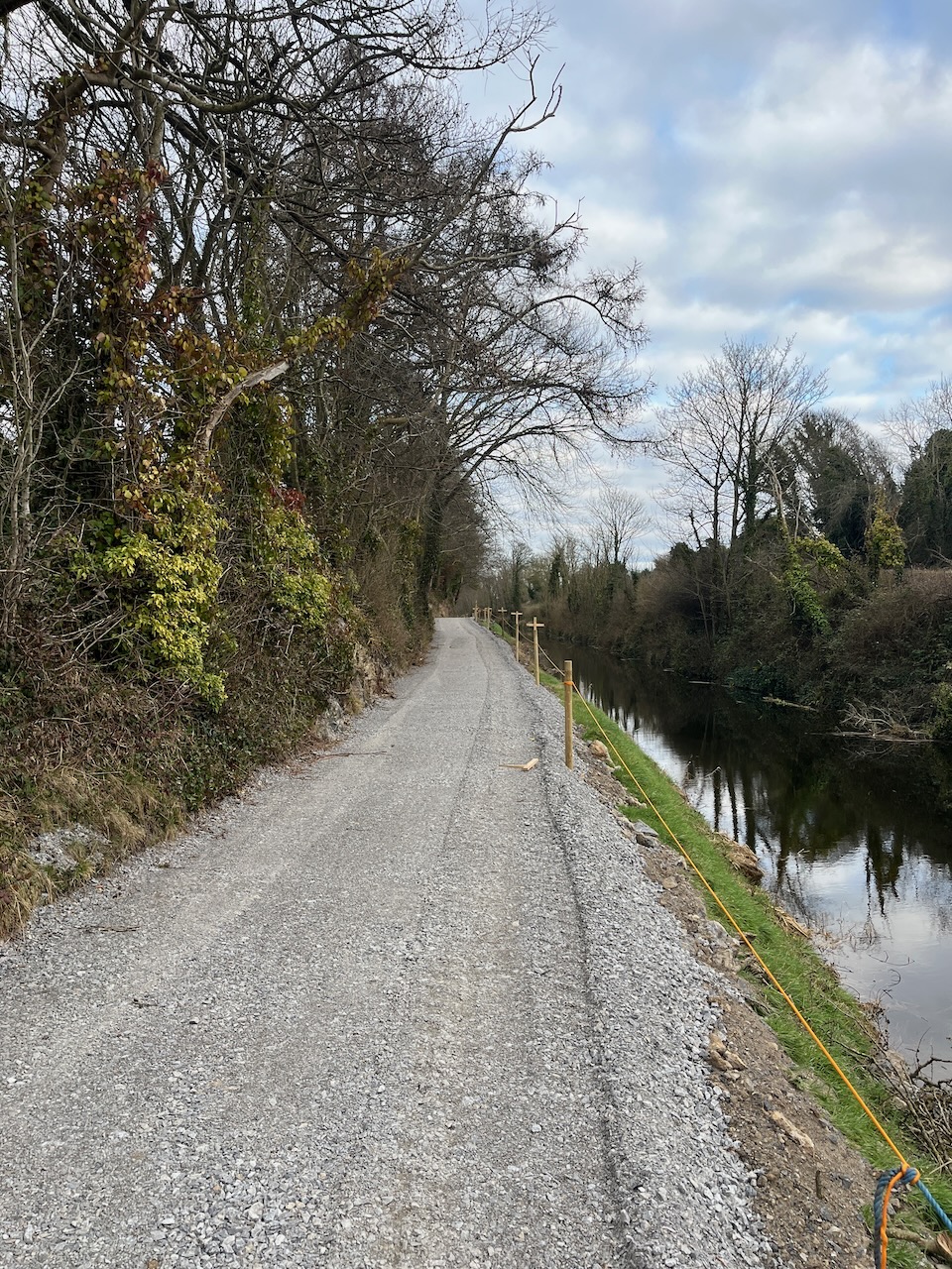 Which only left the long run at the weekend, and as before, with work now on Saturday, and family commitments on Sunday, I got out around three in the afternoon and had about 4k under my belt in the park before I took the Clonee Road out towards the canal. Curious to see how the towpath renovations were proceeding, I stayed on the canal ’til Deey Bridge, at which point the works begin, and the barriers were, in theory, erected to prevent us from accessing the canal until further notice.