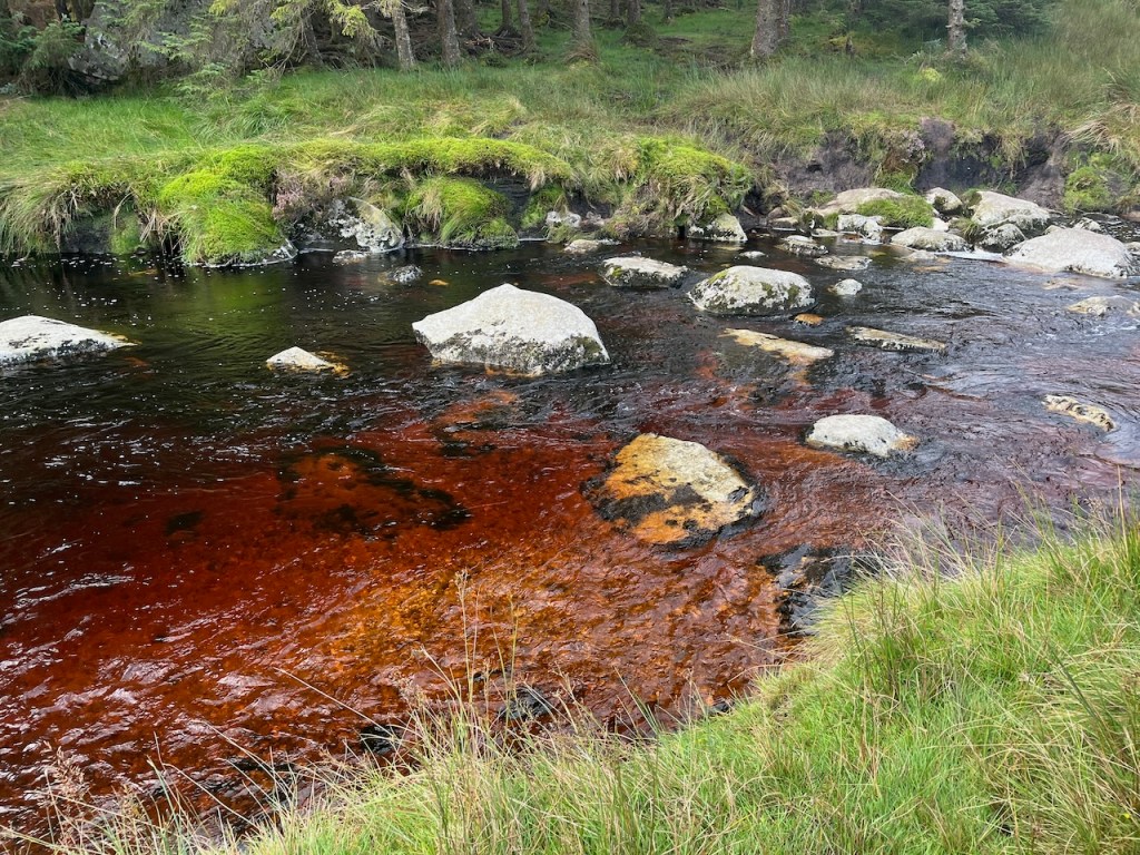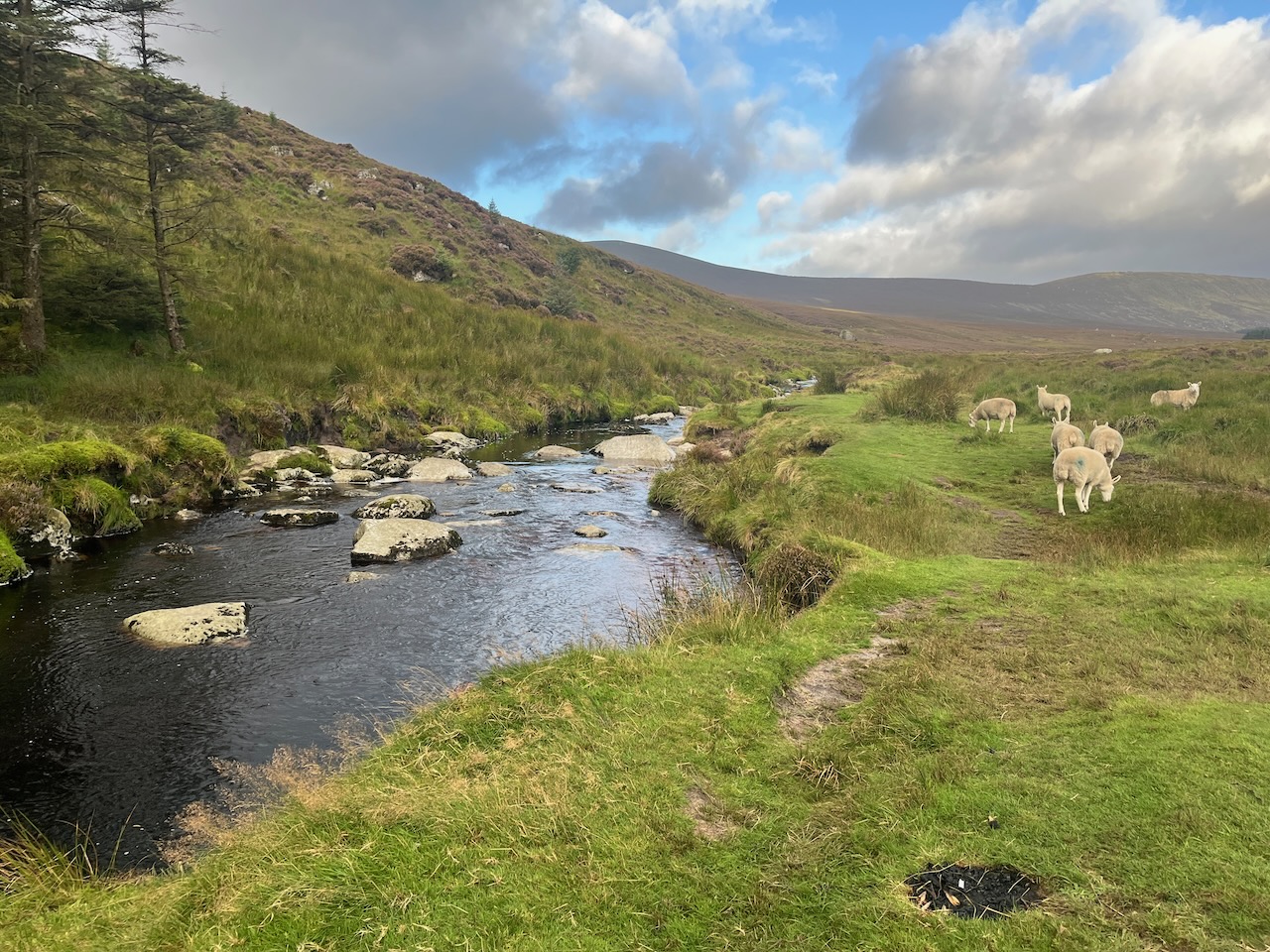The first kilometre and a half or so brings you along the Glenmacnass Stream above the waterfall. This pretty little peaty river joins the Avonmore in Laragh Village, which is then joined by the Avonbeg in the Vale of Avoca to form the Avoca River. At some point, you must cross this stream, and Gary plunged on ahead on the basis that we were going to get our feet wet anyway, so we may as well get it over with. As we emerged from the water, we spied a perfect fording place with ideal boulders a few yards upstream… oh well…