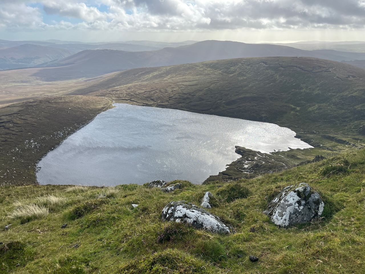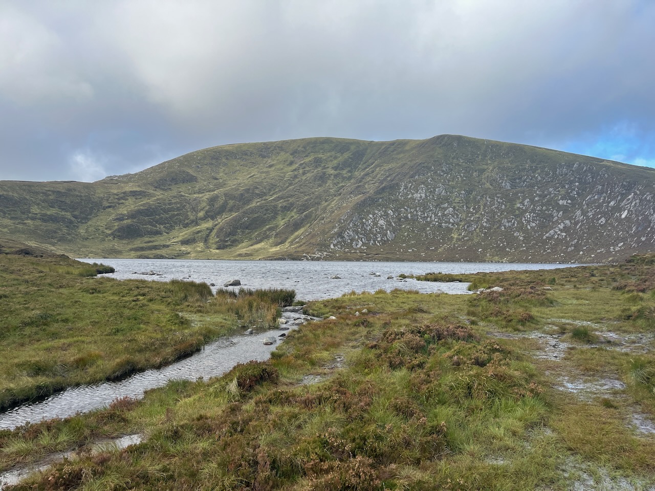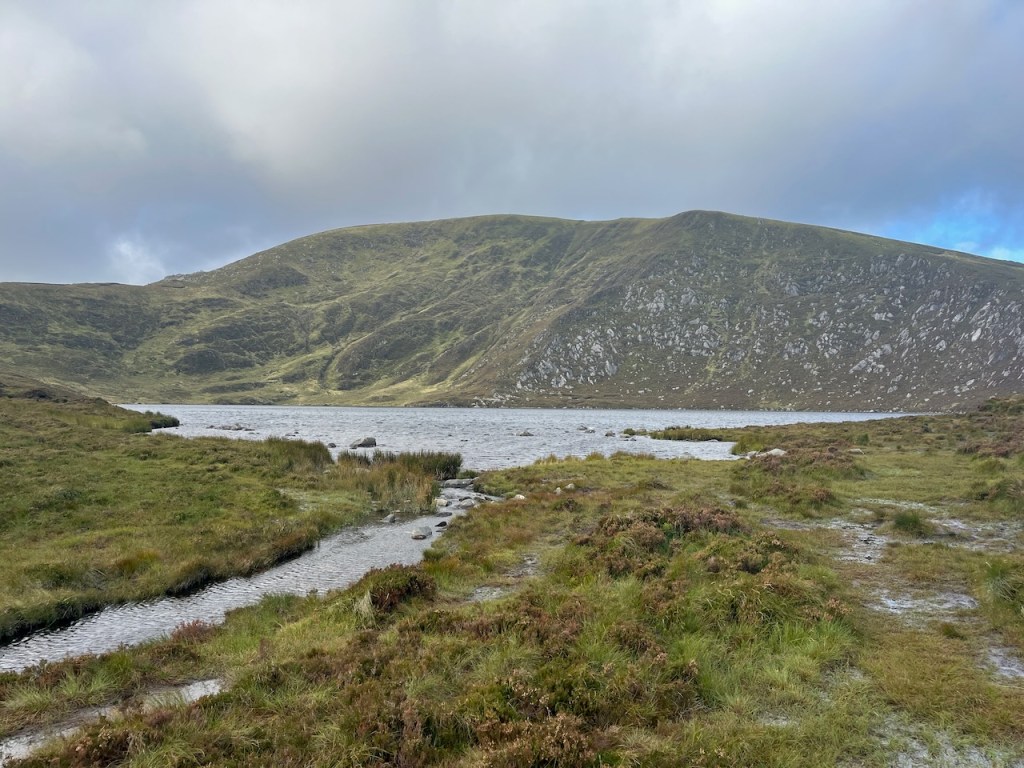 The top of the ridge was reached at about the three kilometre mark, and the ground levelled off in front of us, with the impressive face of Tonelagee now in sight. I knew the Lough would come into view shortly. Within a minute, we were standing at the head of the little stream we had followed, and we stopped for a snack to reward our efforts.