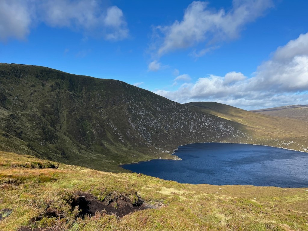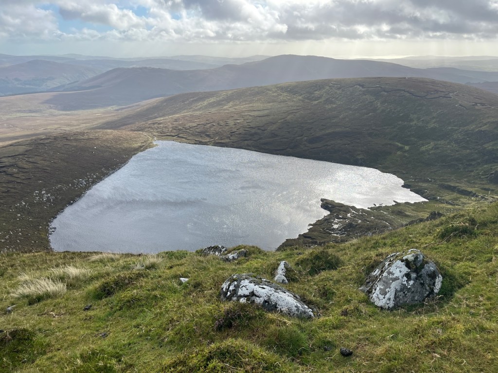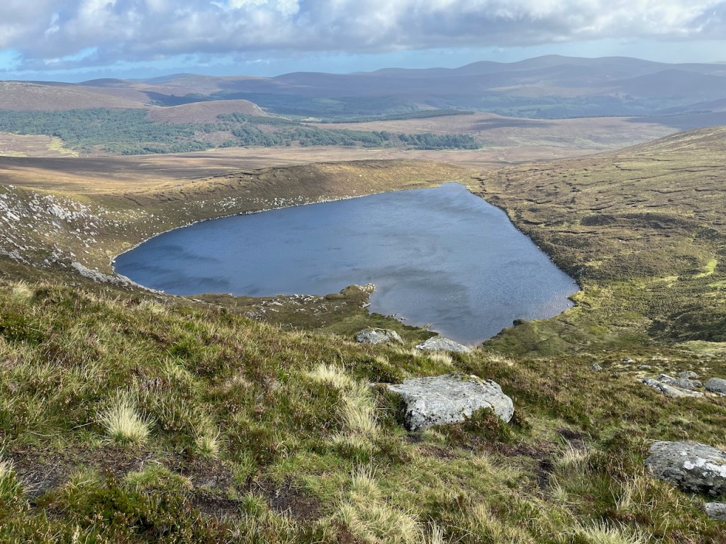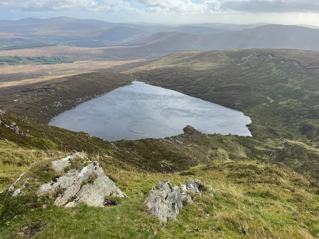 Then it was on to a more strenuous climb as we took on the right flank of the mountain that holds the heart-shaped corrie lake in its cold embrace. Up and up we climbed, and the wind grew stronger, so I removed my cap before the elements took that decision out of my hands. Sure enough, as we reached the summit of Tonelagee, the wind was hugely impressive, as was the view. To our north-east behind us was the sheer drop to the lake, and south-west offered splendid views over the Wicklow Gap and beyond. The engineering marvel that is Turlough Hill was clear to see. Check out the details of this power station with this link. Lough Ouler had made the short list as an option but I am glad they chose to leave it alone.