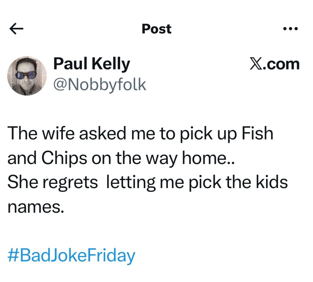 That first joke up above is perhaps my finest Dad-joke moment. Even Tamsyn was impressed. Well, I think she was… That last one caught my eye the other night in the pub… there is a special place in hell for those that cast around apostrophes like snuff at a wake.