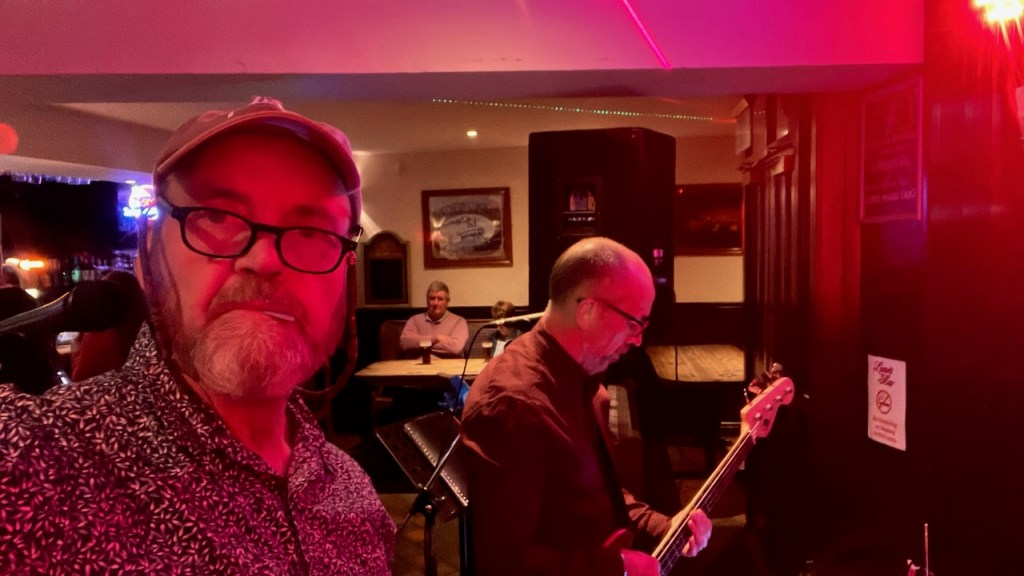 Life, of course, has a habit of going on, regardless. I recall standing in a wing of Connolly Hospital, shortly after my own Dad had died, talking to his doctor about what would happen next. As she gently explained the arrangements for the next few hours, I was drawn to workmen down below, setting out shuttering carpentry for a concrete pour. How does the world keep spinning when your own has ground to a halt? But spin it must. And so, the rotation took our little rock band off down the country to play a gig last Saturday; too late to cancel. But again, sometimes it’s good to do the normal things, and keep your mind busy. We dedicated a Beatles number to my father-in-law. He was a big fan, and he played guitar up to the end, and had a fine voice. I hope he enjoyed the tune.