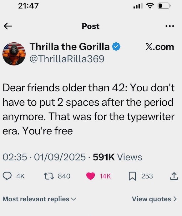 That’s some sad news, but at least he didn’t suffer too long. It did take me a long time to stop doing the old two-space rule.