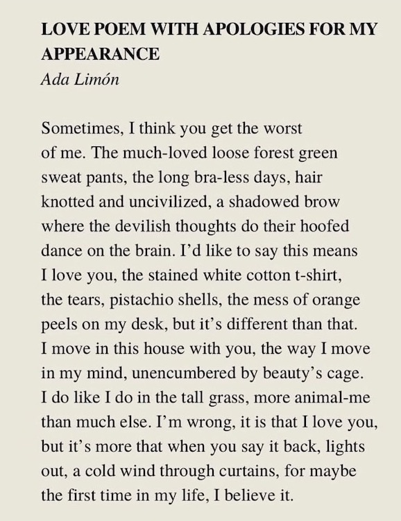 Finally, albeit unbeknownst to you, your bits and bobs at the end contained another “for Risa” delight. Ada Limón was born and raised in Sonoma. Back in the day, she and Roy did a show together — she played Debbie to my husband’s Henry in a local production of The Right Thing.