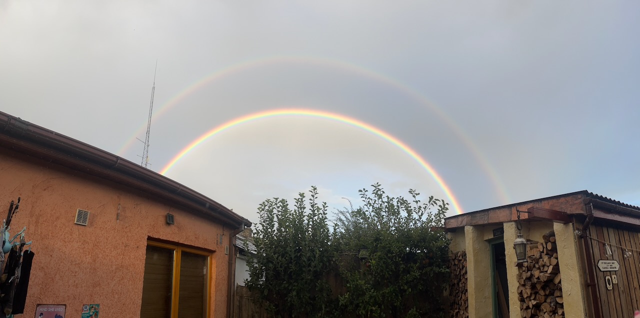 Your successful negative split and terrific photos made a perfect counter-balance. The double-rainbow is surely a good omen for the Kenny household, and the creepy road-to-the-hotel pic a harbinger of October’s inescapable theme.