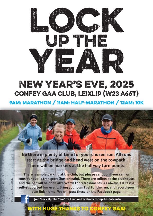 The other official way to wrap up the running season is, of course, Lock Up The Year, which is back at its rightful home of Leixlip, having been moved to Kilcock last year due to canal towpath works. Though St Coca’s AC were fabulous hosts, it must be said. I may drop down to the 10k. Traditionally, I did the half, but I am one of two event organisers, so feel I should be around. Again, regular readers know this as a casual, out-and-back, free and fun run along the Royal Canal towpath. There are no medals, marshals or T shirts. So if you are in the vicinity, you know what to do!
