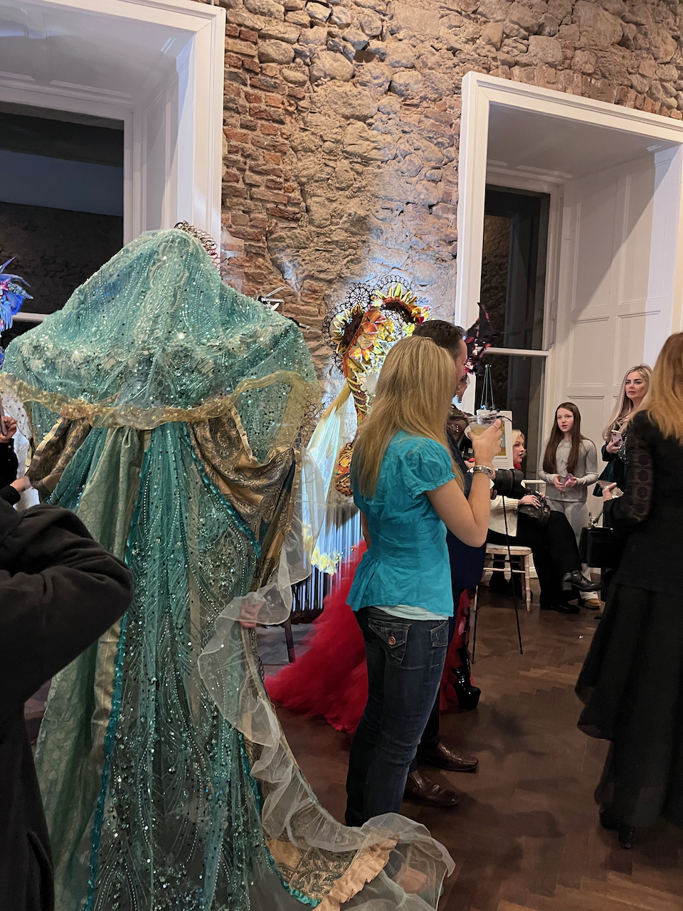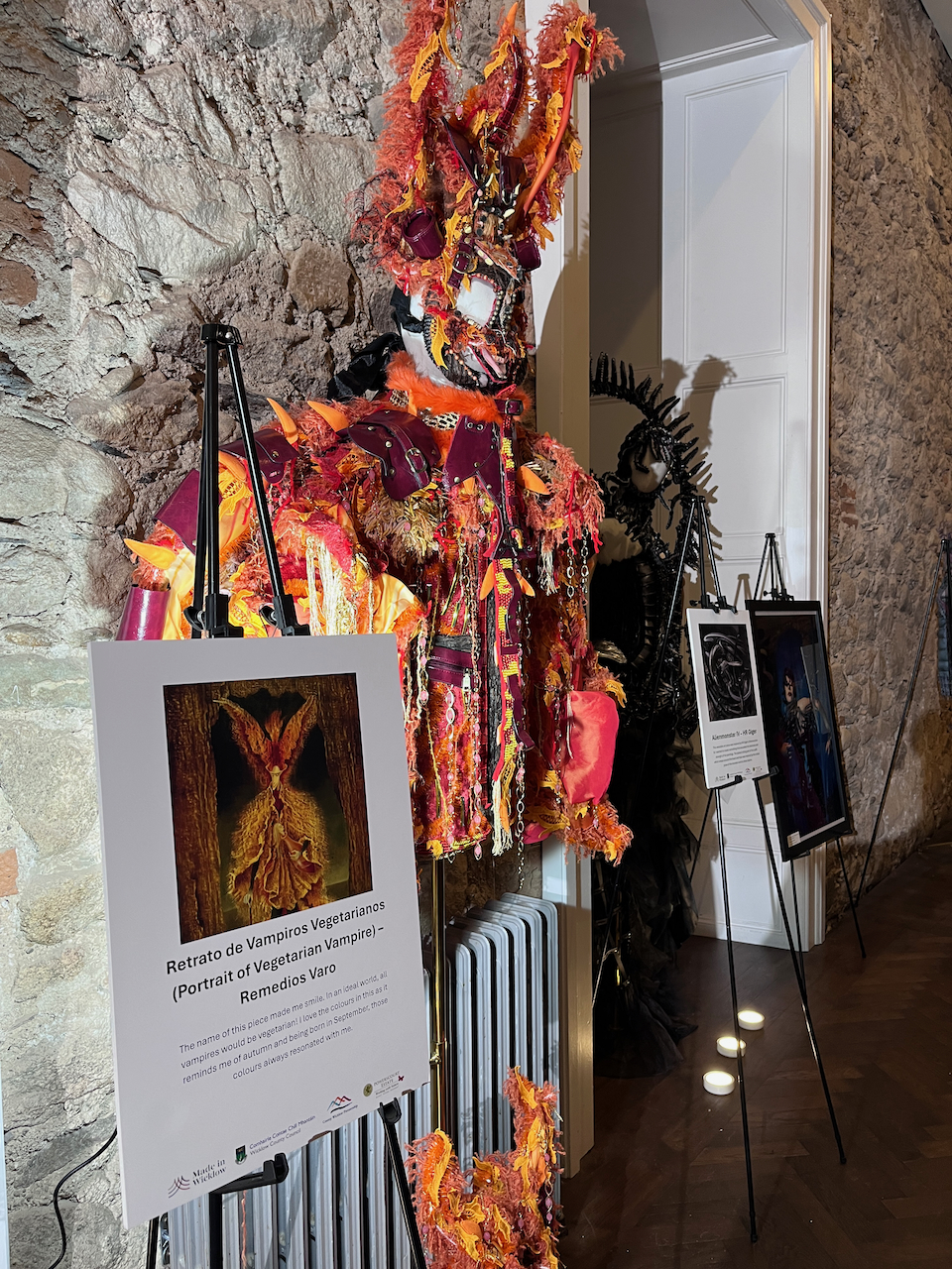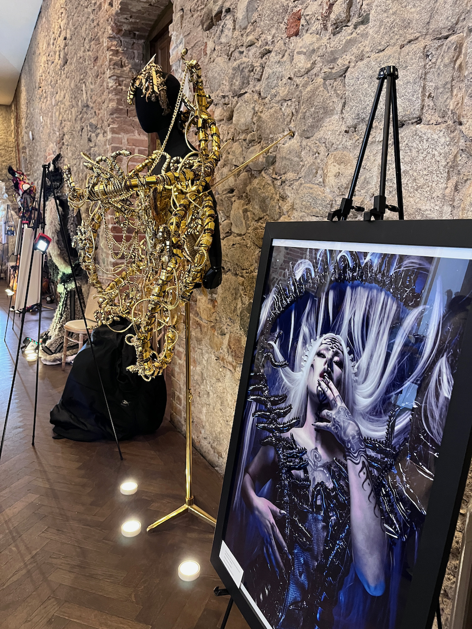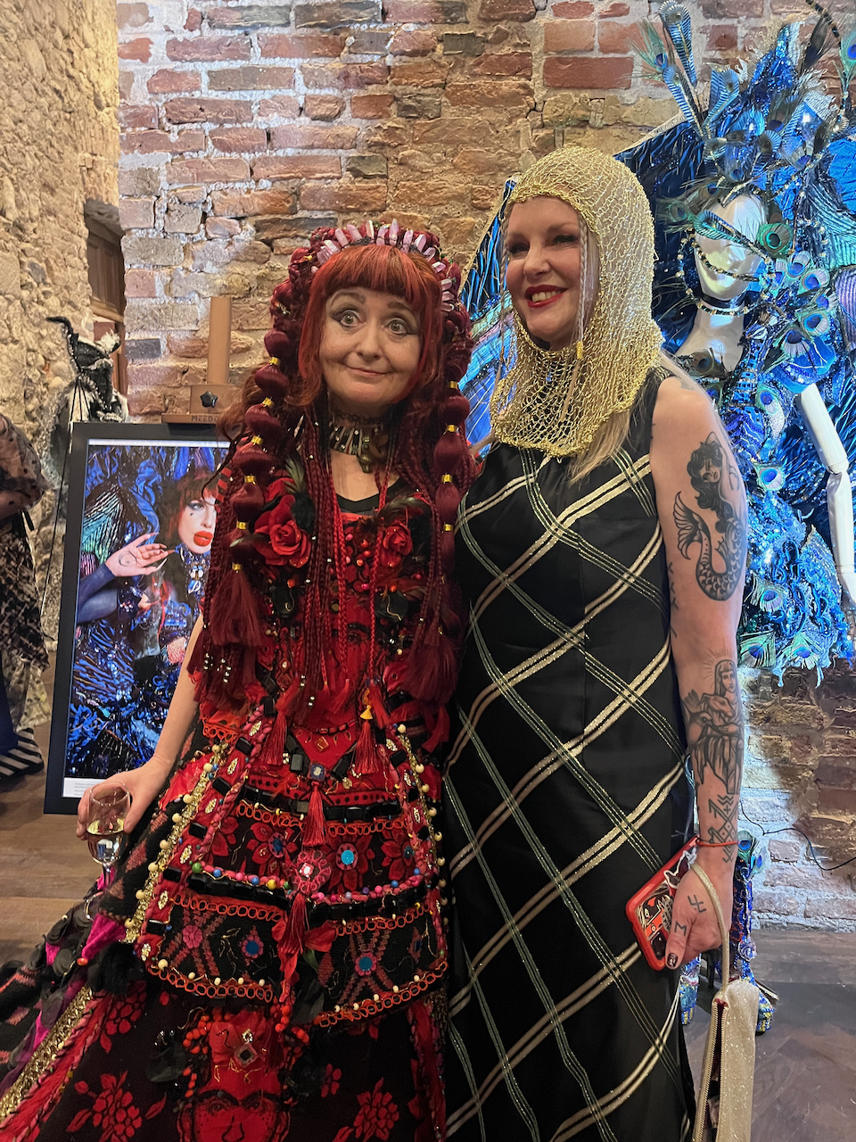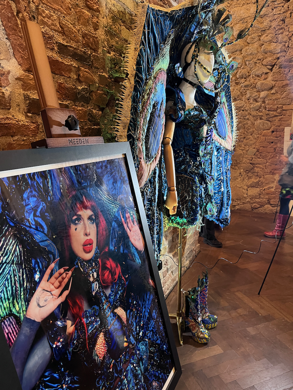 In between, S and I headed out for the night on Saturday. It was the launch of an exhibition of ‘wearable art’ from Irish fashion designer Claire Garvey. The venue was the rather salubrious Powerscourt Estate in Enniskerry, owned and managed by the Slazenger family. Many moons (and a few Orion’s Belts!) ago, I went to art college with Claire back in 1987. She has gone on to great things. Famous folk who have worn her outfits include Lady Gaga and Nile Rodgers. Her stuff is amazing, though I wonder how you could possibly get into an outfit without a coterie of nimble-fingered helpers. Or indeed, in some cases, perhaps one of those gizmos knights used to get into their armour. Live music on the night was provided by the mesmerising Sexy Tadhg. Lots of glam, as you would expect, and plenty of fine gúnas.