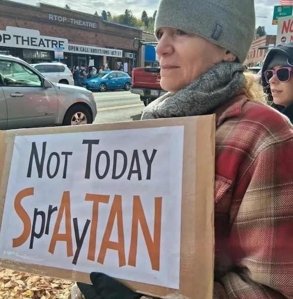 (The Spraytan poster is from the recent No Kings protests in the States)