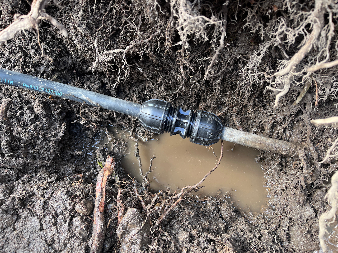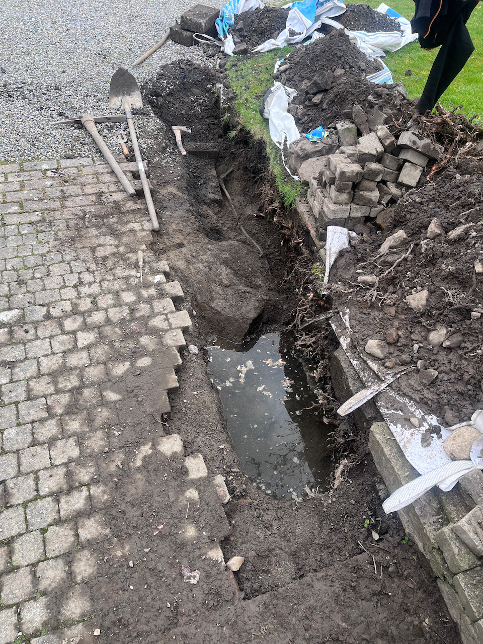 Okay, it may not be the biggest rock in the world, but it’s huge, and thankfully the pipe went around it so it remains where it has lain for, I suspect, about 10,000 years. I attempted a patch repair but it only slowed it down. The problem was the magnolia tree whose roots had all but strangled the old lead 3/4 inch pipe. I think it will have to be felled, sadly. I had to dig back to where it was joined to new hydrodare pipe from a previous repair. During the week, I tried to get my hands on the correct fittings to connect old lead to new plastic, but it wasn’t until my brother arrived on Friday that I was able to get out the following day and hit the right providers who had the right gear and know-how. The actual fitting of the coupling worked out quite well, and we left it for a day to make sure there were no more leaks, and then we backfilled most of it today. I’ll let the hare sit for a few days, then reinstate the cobblelock.